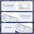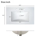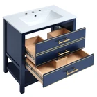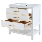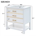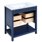 30" Bathroom Vanity Bathroom Storage Cabinet Combo with Sink and Two Drawers Features Perfect Size: Ideal dimensions of 30x18x34 inches to fit seamlessly into your bathroom space, providing a perfect balance of style and functionality. Elegant Design: Upgrade your bathroom with our modern navy blue vanity cabinet featuring gold accents and delicate gold stripe detailing on the drawer fronts. Gold Handles and Stripes: Elevate your bathroom with gold accents – from the chic gold handles to the sophisticated gold stripe detailing, every element exudes luxury. Versatile Storage: Two drawers with different depths provide ample storage for various bathroom essentials. Organize items of different heights effortlessly. Open Storage Space: The cabinet features an open storage space for easy access to frequently used items, giving a contemporary feel to your bathroom. Durable Construction: Crafted with precision, this cabinet is built to last, providing both style and functionality for years to come. Spacious Ceramic Sink: The unit comes with a one-piece ceramic Sink, designed for durability and easy maintenance. Overflow Prevention: The basin is equipped with an overflow prevention feature, ensuring a mess-free and convenient experience. Three Faucet Holes: Conveniently placed three faucet holes in the center for easy installation of your preferred faucet (faucet not included). Assembly Instructions Included: The package includes a comprehensive assembly manual, guiding you through the hassle-free setup process. Modern 30inch Navy Blue Bathroom Vanity with Open Storage, Two Drawers Upgrade your bathroom with our Solid Wood Frame + MDF White Bathroom Vanity Cabinet. Combining classic aesthetics with modern design elements, this cabinet provides both style and durability. The U-shaped drawers, gold accents, and open storage space make it a functional and elegant addition to any bathroom. Assemble with confidence using our detailed instructions included. Transform your space today! Versatile Storage Two drawers with different depths provide ample storage for various bathroom essentials. Organize items of different heights effortlessly. Open Storage Space The cabinet features an open storage space for easy access to frequently used items, giving a contemporary feel to your bathroom. Gold Handles and Stripes Elevate your bathroom with gold accents – from the chic gold handles to the sophisticated gold stripe detailing, every element exudes luxury. Weights&Dimensions Product Size: 29.9"W*18.3"D*33.7"H, 89.17 lbs Sink: 29.9"W*18.3"D*6.69"H, 30.2 lbs Vanity: 29.13"W*17.7"D*33.1"H, 58.97 lbs Sink Package 35.4"*23.9"*12.6", 38.6 lbs Vanity Package 38.8"*21.9"*8.9", 65.47 lbs Weight Capacity: Overall: 110 lbs; Shelf: 44 lbs; Drawer: 11 lbs Specifications Product Name: Bathroom Vanity Origin: Malaysia Style: Modern Mounting Type: Free-standing Cabinet Color: Blue Sink Material: Ceramic Cabinet Material: Solid wood+MDF Handle Material: Zinc Alloy Finish Type: Painted Finish Painted Finish Undermount/Drop in Sink Shape: Rectangular Faucet Mount: Centre 8" (not included) Overflow Hole included: Yes Vanity Top Edge Type: Flat Edge Thickness: 0.6" Number of Doors: Null Number of Drawers: 2 Soft Close Door Hinges: Yes Assembly: Assembly Required Number of packages: 2