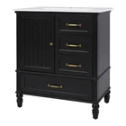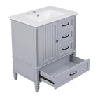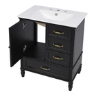 30" Bathroom Vanity with Sink, 3 Drawers, Freestanding Vanity Storage Cabinet Features Material: Practicality and durability is important to bathroom facilities, so we use real wood and MDF boards for this product, which not only increases the product stability but also ensures a long-lasting use. Furthermore, the surface of this vanity cabinet is in painted finish. Smooth Ceramic Sink: Our bathroom basin sink is made of solid ceramic with smooth and water-proof finish, which hardly leaves water stains. The pre-drilled three holes on the top is available to 8" faucet (not included). Besides, the overflow with metal circle is in case of water spilling over when you forgot to turn off the tap. Vanity with Cabinet & Drawers: This bathroom vanity has ample storage space: one cabinet with a door, two drawers and a big drawer below. You can put soaps, towels, shampoos, tissue paper and other bathroom essentials in it so to keep them away from dust. Soft-closing Door: Considering the humid environment in the bathroom, the door hinges and handle are made of metal, which is not easy to rust. In order to keep silent when open and closing the door, we use soft close door hinges to bring a better using experience to you. Assembly Required: This bathroom vanity cabinet and sink, needs full assembly, is in one package. All the hardware and instruction manual are provided. Estimated time to set up: 30 minutes by 2 people. Description Bullet Point 1. 30" Bathroom Vanity with Sink 2. Acacia Wood & MDF & Ceramic & Painted Finish 3. Cabinet with Door & 3 Drawers 4. One Package Details 1. Soft Closing Door & Door Stopper 2. Gold Handle and Knob 3. Metal Hinges & Slide Rails High-quality Material High-quality MDF Board Solid Wood Legs Painted Finish Metal Handles Door Hinges Ceramic Sink Top Pre-drilled Three Faucet Holes Chrome-finish Overflow Compatible with 8" Widespread Faucet (not included) Ample Storage Space Cabinet with Door Two Drawers with Slide Rails One Big Drawer Freestanding Bathroom Vanity Back Open Easy Access for Plumbing Adjustable Foot Pads Product Dimensions&Weights Overall Product 30"L x 18.5"W x 34.4"H Cabinet Base 28"L x 17.1"W x 33.41"H Sink Top 30"L x 18.5"W x 4.7"H (30.86lbs) More Information Shape Rectangular Finish Painted Finish Mounting Type Freestanding Number of Sinks Accommodated 1 Sink Type Undermount; Drop-In Sink Location Center Vanity Top Edge Type Flat Edge Thickness 0.6" Faucet Mount 8"(not included) Hardware Included Yes Capacity 200lbs Backsplash/Sidesplash Included No Number of Doors 1 Number of Drawers 3 Assembly Assembly Required