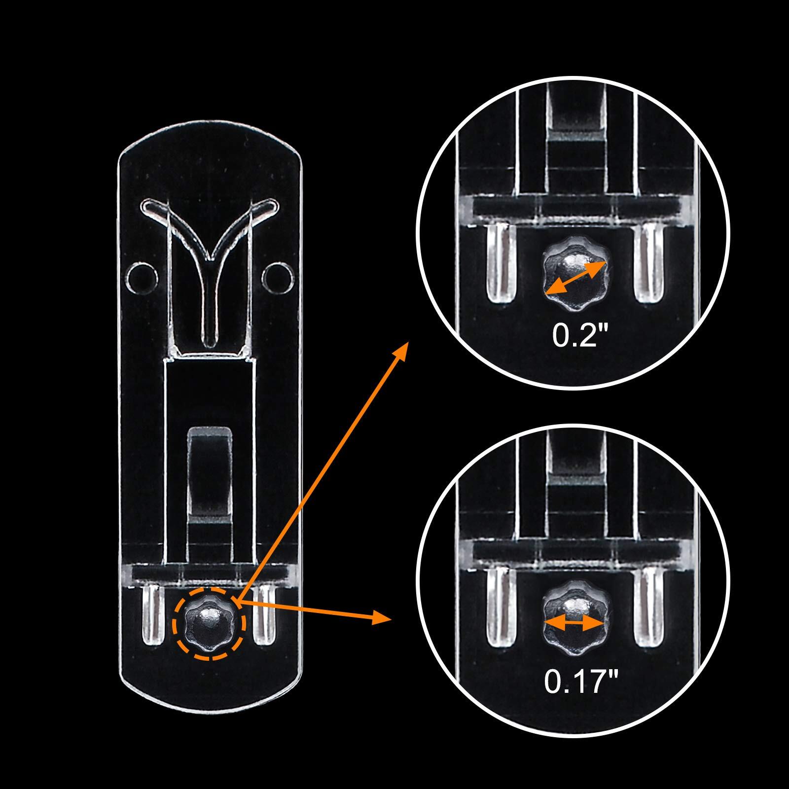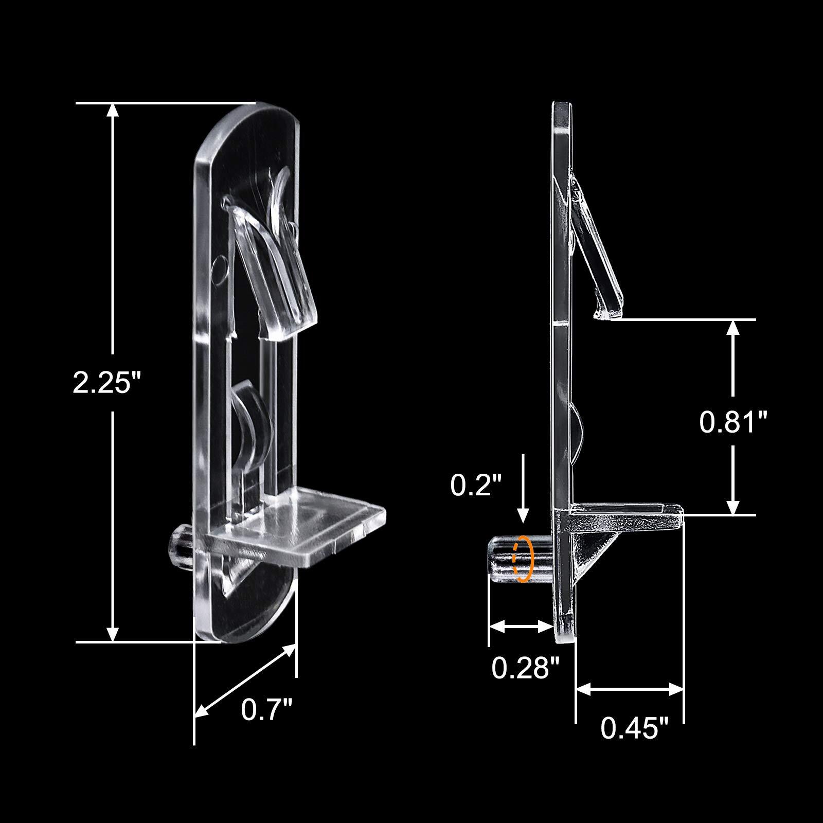 Features: * Thicken Plastic Material These shelf pegs are made of transparent thicken plastic, invisible looking and good bearing capacity, can be matched with any home improvement style. Durable and practical. * Self-locking Design According to the principle of triangular mechanics, our shelf support pin adopts self-locking design, which can provide strong grip and supporting effects without any screws. Easy for installing while ensuring nice holding capacity. * Size Information -- Suitable shelf thickness: 13/16" -- Outer Diameter of Peg (Measure from the ridge): 1/5" -- Inner Diameter of Peg (Measure from the dented part): 3/16" !! Please care: Because different pins fit different hole size, and after long-term use, the previously drilled holes will be enlarged. Please determine the size that fits the hole before replacing your old shelf pins * Easy Installation No use for any screws, the clear furniture shelf supporter are very easy to install by hand. Just push support pegs in the drilled hole, then you get a relaxing installation experience. Work on Different Shelfs Ideal for medicine cabinet, kitchen cabinet, furniture, wardrobe, closet, cupboard, book shelf, pantry shelving, etc. * Satisfying Customer Services We provide 48-days money-back and timely after-sale response, if you have any questions, please us. We will try our best to solve your issue as soon as possible. Welcome to , your satisfaction is always what we pursue. 【Thick Sturdy Plastic】:Made of high quality thicken plastic, invisible and durable. Meet your requirement for both good-looking and last-using. 【Self-locking Design】: Self-locking design, come with strong grip and easy to install; Stable triangular structure provides nice support, ensuring greater bearing capacity. 【For 20mm Shelf】: The shelf holders fit for 20mm/0.79inch thick board, and 5mm/0.2inch outer diameter of them. Please note that drilled hole should be slightly smaller(about 5mm) than its diameter. 【Warm installation tips:】:If your original hole is larger than 5mm, you can also use the tape we provided to wrap around the nail to increase the diameter of the partition pin.The thickness of the product itself is 2mm, and it is necessary to reserve 2mm space at both ends of the partition before installation. 【Wide Application】:No use for any screws, the clear furniture shelf supporter are very easy to install by hand.Just push support pegs in the drilled hole, then you get a relaxing installation experience.Ideal for medicine cabinet, kitchen cabinet, furniture, wardrobe, closet, cupboard, bookcase, pantry shelving, etc.