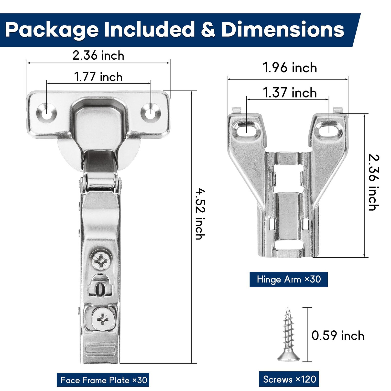 30 Pack 1/2" Overlay Face Frame Soft Close Hidden Cabinet Hinges, 105 Degree 3D Adjustable Clip On Plate Concealed Kitchen Cupboard Door Hinges with Screws Quick & Easy Installation: Clip-on mounting plate design allows for fast, one-person installation with 3-way adjustability for perfect alignment. Premium Durability: Made from heavy-duty cold-rolled steel with a nickel-plated finish for long-lasting use and frequent opening and closing. Soft-Close Technology: Built-in piston damper and strong spring ensure smooth, quiet door closure, preventing slamming and finger pinching—ideal for homes with children and pets. Concealed Modern Design: Hidden hinge construction maintains the clean and stylish appearance of cabinets in kitchens, bathrooms, and more. Suitable for 14-22 mm thick doors with a 105-degree opening angle. Package Include: Hinge arm x 30 face frame plate x 30 screw x 120 Finish Color: Silver Material: Cold-rolled steel , Nickel-Plated. 【Easy to Install】The clip-on mounting plate design allows you to easily detach the hinge arms from the cabinet mounting plate, so you won't have to hold the door during installation. This makes the installation quicker and more convenient. Additionally, the 3-way adjustability offers precise six-directional movement (up/down, left/right, forward/backward) to ensure perfect alignment without the need to remove the self-closing cabinet hinges, saving you both time and effort 【Premium Materials】The kitchen cabinet door hinges are crafted from high-quality, heavy-duty cold-rolled steel with a nickel-plated finish. Using superior forging technology and precision craftsmanship, these hinges are built for long-lasting performance and can withstand frequent use. They are perfect for kitchen, bathroom, and other face frame cabinets 【Soft Close Feature】The cabinet hinge features a built-in piston damper and a strong spring, ensuring smooth, quiet operation. Say goodbye to slamming cabinet doors! It reduces noise, extends the hinge's lifespan, and prevents finger pinching, making it ideal for households with pets and children, creating a more comfortable home environment. The concealed design keeps the hinge hidden between the door and cabinet frame, maintaining the clean, modern, and stylish look of your cabinets 【Product Includes & Specifications】The package includes 30 hinge arms, 30 face frame plates, and 120 screws. The diameter of the hinge cup is 35 mm, with a cup depth of 10.5 mm. The screw hole distance on the door is 45 mm, and it accommodates door thicknesses ranging from 14 mm to 22 mm. The opening angle is 105 degrees 【Service Guarantee】These hinges are perfect for all types of face frame cabinets, whether in kitchens, bathrooms, kids' rooms, offices, or workshops. Their premium soft-close design makes them ideal for households with children or pets, and for anyone who values safety, a modern look, and a quieter home. Upgrade your cabinets by swapping out old hinges to enhance your home's comfort. If you have any questions about our cabinet hinges, please contact us right away; we're always here to support you