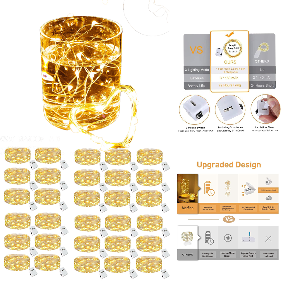 Feature: High brightness, low power consumption Energy-saving and environmentally friendly. Powered by battery (battery included) High flexibility - soft plastic rope, soft and flexible, can be wound around anywhere. Add decoration to your computer, Christmas tree and workbench, easily creating a festive atmosphere. Specification: Cable material: Copper Cable length: 2 meters Number of LEDs: 20 Color: Warm white/Multicolor Function mode: Always on Waterproof rating: IP65 Product quantity: 30 Note: Copper wire has waterproof properties. You can place it wherever you like (but the CR2032 battery compartment is not waterproof, please keep it away from water and damp environments)