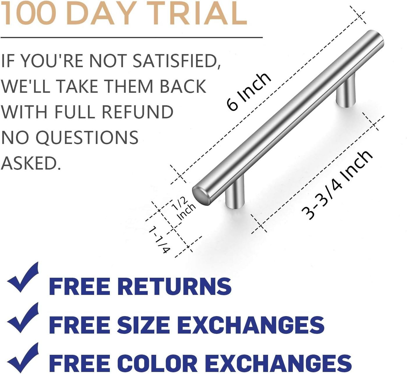 If you're replacing your handle, measure and ensure the center to center hole spacing of the current handle is 3-3/4 inches. Installing new cabinet handles, drill two holes with center to center spacing of 3-3/4 inches. DURABLE & STRONG:30 bar pulls made of stainless steel finished with classic satin nickel coordinates well with other nickel appliances and accessoriess. Simple look: The Brushed Nickel cabinet handles have a wide appeal across a range of kitchen cabinet doors and drawers. The Satin Nickel handles have a clean and timeless look that works with farmhouse, vintage, traditional and transitional styles. [MEASUREMENT]: Screw-hole center: 3-3/4 inch(96mm), Total Length:6 inch(152mm), Diameter:1/2 inch(12mm) Projection:1-1/4 inch(32mm) Product Description