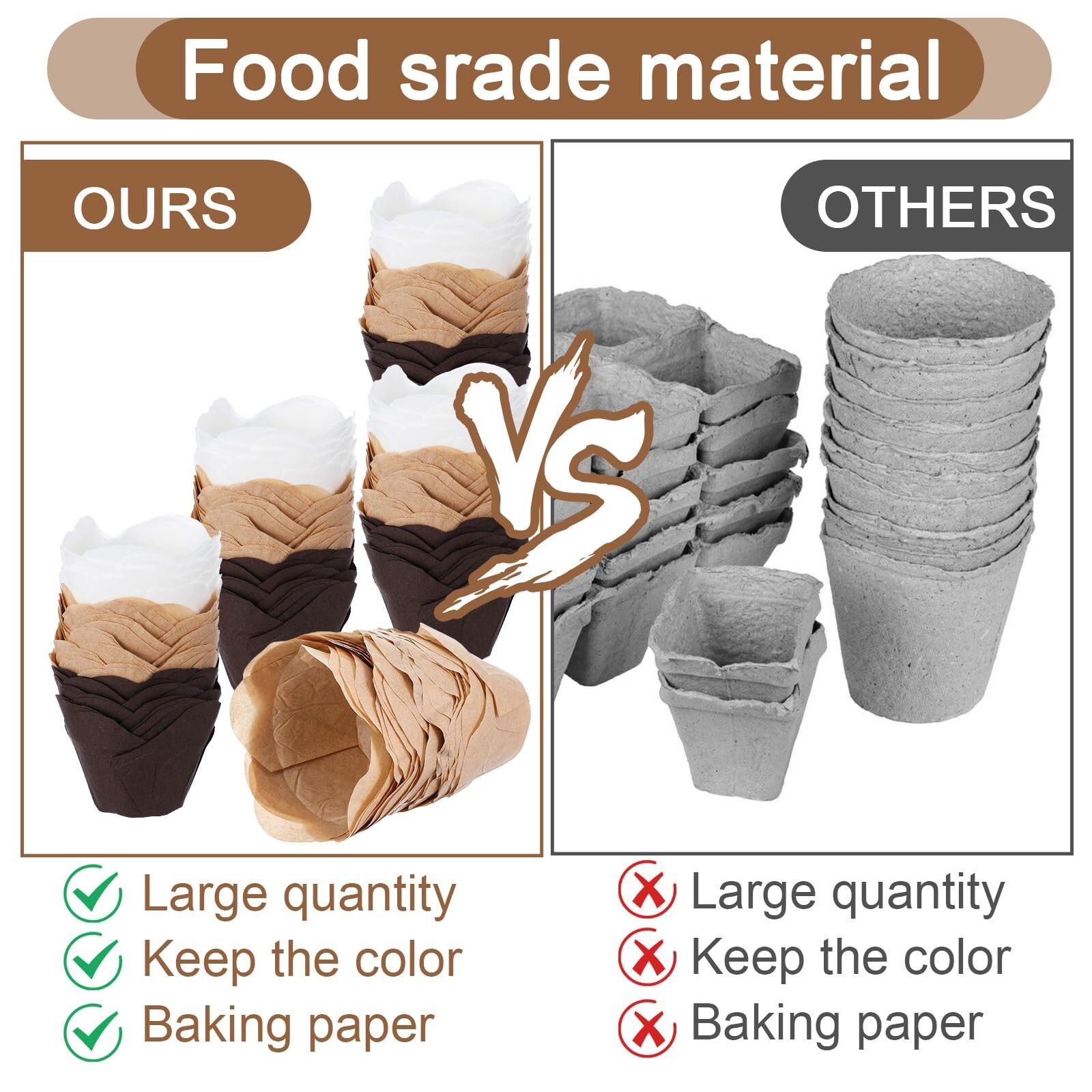 300 Pcs Lotus Tulip Cupcake Liners Baking Muffin Paper Baking Cups Cupcake Liners Holders Cupcake Wrapper for Party, Wedding, Birthday, Christmas, Baby Showers, 3 Colors Product Details Color: white,gold,coffee Brand: JOUTYFOR Material: Paper Reusability: Disposable Occasion: Birthday,Birthdays,Christmas,Party,Wedding Color: white,gold,coffee Brand: JOUTYFOR Material: Paper Reusability: Disposable Occasion: Birthday,Birthdays,Christmas,Party,Wedding Material Feature: Natural Shape: Round Size: as shown in pictures Manufacturer: JOUTYFOR Number of Items: 300 Package Dimensions: 9 x 6.3 x 5.1 inches Item Weight: 12.8 ounces Country of Origin: China Item model number: AM555793_1 Date First Available: November 12, 2024 Elegant Design: these paper cupcake liners come in classic colors of white, gold, and coffee, adding different styles to your cupcakes; The crown flower design brings an elegant touch to your baked goods, making them suitable for weddings, anniversaries, birthdays, and more Quality and Safe: made of wood pulp, these muffin liners are none of fluorescence and safe to use; They ensure no toxic and no odor, giving you peace of mind about your health; Additionally, they can withstand temperatures of up to 220 Centigrade/425 Fahrenheit, higher than most recipes call for, making them oven safe and eliminating safety concerns Easy to Clean and Use: with these muffin liners for baking, you won't have to worry about your muffins or cupcakes sticking to the pan; They are designed to avoid sticking, allowing for easy removal and cleaning without hassle; Say goodbye to scrubbing or scraping the pan to remove leftover cake, as these liners make baking a breeze Abundant Quantity: the package includes 300 cupcake baking cups, with 100 pieces per classic color; This means you'll have enough liners to last through multiple baking sessions; Suitable for baking enthusiasts, party planners, or people who like to bake in bulk, these liners will keep you well stocked for your baking needs Versatile Fit for Standard Baking Trays: these cupcake liners are suitable for most standard size baking trays; With an upper diameter of about 3.5 inches and a depth of about 2 inches, they provide a suitable fit for your cupcakes or muffins; The base diameter of about 2 inches ensures stability and even baking; You can trust that your baked goods will come out ideally with these liners Easy to Clean and Use: with these muffin liners for baking, you won't have to worry about your muffins or cupcakes sticking to the pan; They are designed to avoid sticking, allowing for easy removal and cleaning without hassle; Say goodbye to scrubbing or scraping the pan to remove leftover cake, as these liners make baking a breeze. Quality and Safe: made of wood pulp, these muffin liners are none of fluorescence and safe to use; They ensure no toxic and no odor, giving you peace of mind about your health; Additionally, they can withstand temperatures of up to 220 Centigrade/425 Fahrenheit, higher than most recipes call for, making them oven safe and eliminating safety concerns. Specifications: Material: Wood Pulp Color: white,gold,coffee Size: as shown in pictures Package includes: 300 x Cupcake liners Notes: Manual measurement, please allow slight errors on size. The color may exist a slight difference due to different screen displays.
