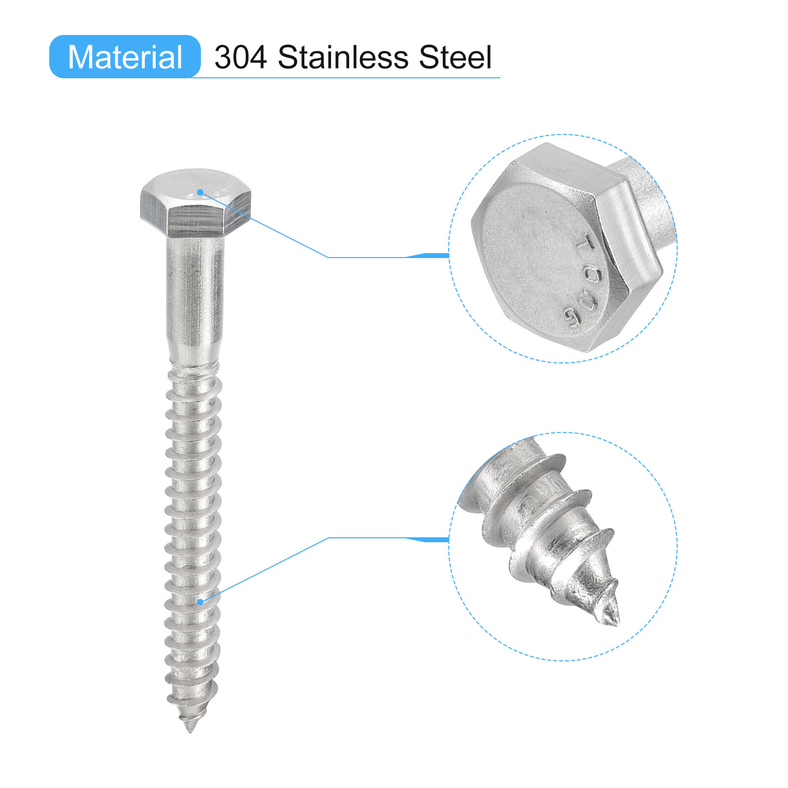 Document 1. Hex lag screws, also known as lag bolts, are wooden fasteners commonly used in construction projects such as building decks, fences, docks, bridges and other outdoor structures. They are hexagonal in shape with a pointed tip and have coarse threads making them strong and durable. They have a high level of holding power and are resistant to vibration and loosening.2. Made of 304 stainless steel material, which is corrosion-resistant and oxidation-resistant, ensuring that the bolts can withstand pressure and tension without deformation or breakage. The pickling passivation surface treatment gives the bolts a clean, beautiful and shiny finish.3. The hex self-tapping screws can be installed quickly and easily with a socket wrench or a hex wrench.4. Hex head lag screws can be used in a variety of applications including wood to wood, wood to concrete, and other heavy construction projects such as bridge building, dock building, deck building, shelving, furniture building, etc.Tips: To prevent splitting, drill a guide hole slightly smaller than the screw.Specification:Material: 304 Stainless SteelSurface Treatment: Pickling PassivationThread Size: 5/16" x 3"Threads Per Inch: 18Hex Head Size: 12.5 x 5.3mm / 0.49" x 0.21"(W*T)Package Content: 20pcs x Hex Lag Screws Hex Head Lag Screws Bolts, 20pcs 5/16" x 3" 304 Stainless Steel Wood Screws 1. Hex lag screws, also known as lag bolts, are wooden fasteners commonly used in construction projects such as building decks, fences, docks, bridges and other outdoor structures. They are hexagonal in shape with a pointed tip and have coarse threads making them strong and durable. They have a high level of holding power and are resistant to vibration and loosening. 2. Made of 304 stainless steel material, which is corrosion-resistant and oxidation-resistant, ensuring that the bolts can withstand pressure and tension without deformation or breakage. The pickling passivation surface treatment gives the bolts a clean, beautiful and shiny finish. 3. The hex self-tapping screws can be installed quickly and easily with a socket wrench or a hex wrench. 4. Hex head lag screws can be used in a variety of applications including wood to wood, wood to concrete, and other heavy construction projects such as bridge building, dock building, deck building, shelving, furniture building, etc. Tips: To prevent splitting, drill a guide hole slightly smaller than the screw. Specification: Material: 304 Stainless Steel Surface Treatment: Pickling Passivation Thread Size: 5/16" x 3" Threads Per Inch: 18 Hex Head Size: 12.5 x 5.3mm / 0.49" x 0.21"(W*T) Package Content: 20pcs x Hex Lag Screws Hot Item Payment 1.We accept eBay payment . 2.Payment must be received within 7 business days of auction closing. Shipping 1.We ship to your eBay or Paypal address. Please make sure your eBay and Paypal address is correct before you pay. 2.Items will be shipped within 1-3 business day when we received payment. 3.Delivery time depends on destination and other factors. Description Policy Hex Head Lag Screws Bolts, 20pcs 5/16" x 3" 304 Stainless Steel Wood Screws 1. Hex lag screws, also known as lag bolts, are wooden fasteners commonly used in construction projects such as building decks, fences, docks, bridges and other outdoor structures. They are hexagonal in shape with a pointed tip and have coarse threads making them strong and durable. They have a high level of holding power and are resistant to vibration and loosening. 2. Made of 304 stainless steel material, which is corrosion-resistant and oxidation-resistant, ensuring that the bolts can withstand pressure and tension without deformation or breakage. The pickling passivation surface treatment gives the bolts a clean, beautiful and shiny finish. 3. The hex self-tapping screws can be installed quickly and easily with a socket wrench or a hex wrench. 4. Hex head lag screws can be used in a variety of applications including wood to wood, wood to concrete, and other heavy construction projects such as bridge building, dock building, deck building, shelving, furniture building, etc. Tips: To prevent splitting, drill a guide hole slightly smaller than the screw. Specification: Material: 304 Stainless Steel Surface Treatment: Pickling Passivation Thread Size: 5/16" x 3" Threads Per Inch: 18 Hex Head Size: 12.5 x 5.3mm / 0.49" x 0.21"(W*T) Package Content: 20pcs x Hex Lag Screws Hot Item Payment 1.We accept eBay payment . 2.Payment must be received within 7 business days of auction closing. Shipping 1.We ship to your eBay or Paypal address. Please make sure your eBay and Paypal address is correct before you pay. 2.Items will be shipped within 1-3 business day when we received payment. 3.Delivery time depends on destination and other factors.