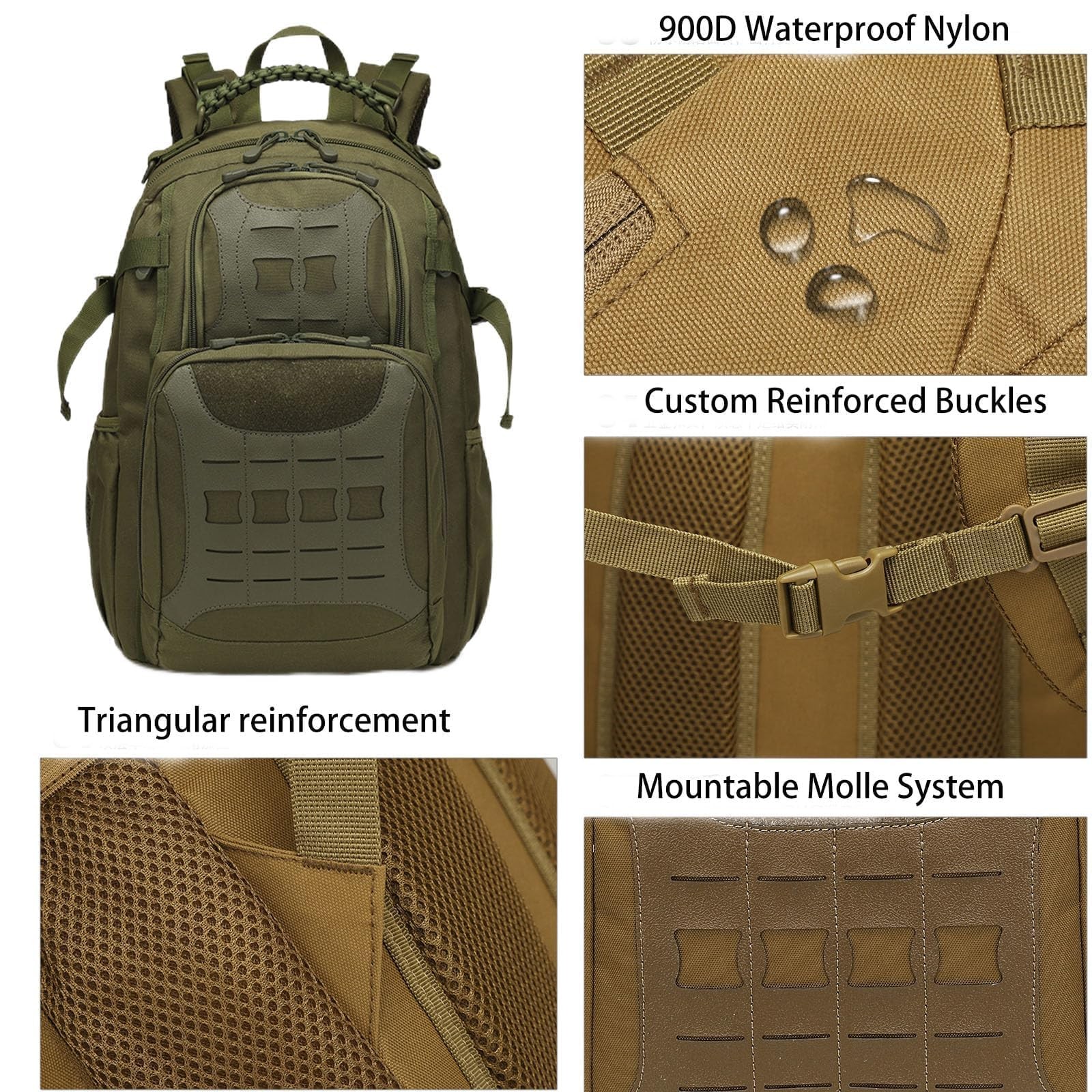 This backpack is designed with ample storage space and multiple pockets to accommodate a variety of items. It features a separate compartment that can hold 15.6-inch laptops, as well as 15-inch, 14-inch, and 13-inch laptops. The spacious packing compartment is perfect for daily essentials and tech electronics accessories. The front compartment is equipped with multiple pockets, pen pockets, and a key fob hook, ensuring that your items are well-organized and easy to find.The backpack is comfortable and sturdy, thanks to its soft padded back design and thick, multi-panel ventilated padding. This provides maximum back support, ensuring that you feel comfortable even when carrying heavy loads. The breathable and adjustable shoulder straps help to alleviate shoulder stress, while the foam padded top handle allows for a comfortable carry on for extended periods. Built to Last: Heavy-Duty 900D Tactical BackpackCrafted with military-grade 900D polyester and reinforced double-stitched seams, this rugged backpack withstands extreme outdoor use. Water-resistant coating and scratch-proof finish ensure durability for hiking, survival missions, or daily commutes. Compact 30L Tactical Backpack for Versatile UseDimensions: 18.1”x11.8”x7.5” (46x30x19cm). Ideal 30L capacity balances portability with ample space for gear. Customize with patches via the oversized Velcro panel—perfect for military patches, morale badges, or personal flair. Expandable MOLLE System for Tactical CustomizationUpgrade your loadout with laser-cut MOLLE webbing, compatible with pouches, hydration packs, or survival kits. Attach first-aid holders, knife sheaths, or sleeping bags effortlessly for mission-ready versatility. Smart Storage: Tactical Backpack with Laptop CompartmentOrganize gear in 4 compartments: dual front pockets, vertical dual-access admin panel, and a main chamber with mesh/zips. Fits a 15” laptop, water bottles, and tools. Bonus: hidden padded slot for valuables. Ergonomic Design for All-Day ComfortBreathable padded shoulder straps and adjustable chest/waist belts distribute weight evenly. Use as a bug out bag, EDC backpack, or hiking pack—zippers glide smoothly, while ventilated back padding reduces sweat buildup.