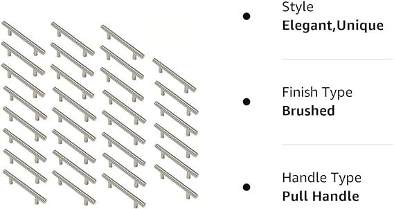 Brushed Nickel Kitchen Cabinet Pulls Stainless Steel Drawer T Bar Handles 30PCS Features: SLEEK DESIGN : Instantly transform your cabinets, cupboards, drawers, bathrooms, and more with this modern, contemporary handle set. Constructed with stainless steel and a brushed satin nickel finish, these elegant t-bar pulls allow you to transform your cabinets in a quick and easy way that updates your kitchen and saves you money for other projects. LIGHTWEIGHT : Each handle is hollow, which lends a proper weight balance to any cabinet drawer and door to which you apply them. This makes for simple operation for adults and kids alike, and maximizes compatibility with an array of woods used in your cabinetry. Add style and enhanced value to your home! BUILT TO LAST : Built with premium materials, correct mounting holes, matching mounting screws, and a finish that won’t arrive at your door scratched. The satin nickel finish not only enhances the stainless steel construction, it also acts as a wear-resistant barrier that will keep your handles looking fresh for years to come. Specifications: T-Bar Style Overall Length: 128mm/5" Diameter: 12mm Center to Center Hole: 76mm/3" Surface: Brushed Finish Screw size: approx.4 x 25mm (W x L) Material: Stainless Steel Cabinet Handle Set Package Included: 30 x Stainless Steel T Bar Pulls 60 x Screws(Each pack has 2 screws) Notice: Please allow 1-3Cm error by the manual measurement. Shipping Payment Returns Contact Us Warranty Shipping We only ship to paypal registered address . So please be assuring your address in paypal is correct and valid . Please read for your own benefit and understanding on our shipping items All the items will be dispatched to you within 2 business day the pacakge you can tracking on the fedex ups and usps purchase price do not cover any applicable tax or duty that might be charged by customs ,buyers are responsible for such charges if you have not received your package as our declaring in description please contact me before you want to leave feedback we can refund money or resend item as your choice Payment We accept Pay pal payment only. Payment should be completed within 4 (Four) days of auction closing. Or unpaid dispute will be filed for closing auction. We will leave a positive feedback immediately after payment is received. We appreciate a positive feedback as much as you do. If for some reason there is any issue with the purchase, please contact us prior to leaving feedback, we will be glad to work together and provide a satisfying solution Returns After receiving the item, contact seller within Return shipping 30 days Buyer pays return shipping Return policy details Returns allowed for 30 days on unwanted items. Item must be unused and unopened. Return postage to be borne by customer. Damaged or Faulty Items - please inform us on receipt and we can arrange for replacements/returns/refunds on an individual basis. This does not affect your statutory rights Contact Us we will reply message or E-mail in 7-10hours our working time :monday -sunday 9:00am-22:30pm ( GMT+08:00Beijing ) 1:00am-14:30pm ( GMT+00:00London ) 19:00pm-08:30pm ( GMT+06:00USA / Canada ) Warranty 100% assurances of quality and service If you are not completely satisfied with your product, let us know within 14 days after receiving the product, and you can also send us an e-mail message, we will deal with the problem of returns and exchanges for you in the first time. We will not bear the back freight if it is not the problem of product quality. Now you can get the wholesale price directly from our store!