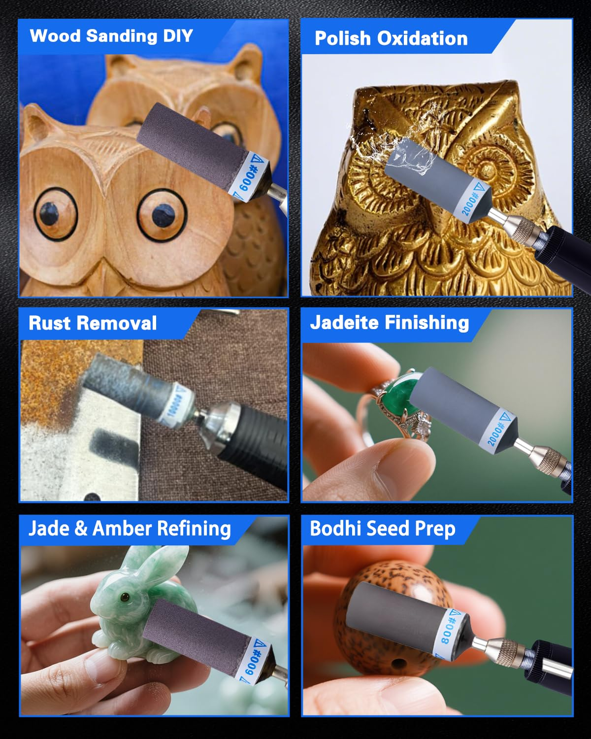 Scientifically-Optimized Grit Progression:30PCS sanding drums for dremel with 400/600/800/1000/1500/2000 grit (5PCS each), scientifically graded for 6-stage grit system. This research-backed grit progression handles every stage, from rough shaping to final finishing - delivering superior results Upgraded Adhesive Base: Tightly wound sanding bands with reinforced glue ensure longer lifespan. Simply peel off worn layers of sanding discs to reveal a fresh polishing surface, reducing the expense and waiting time of frequently replacing sanding heads Electric Sanding at Warp Speed: For dremel tool accessories fits all 1/8 inch shank rotary tools, like for Dremel 3000/4000, etc. Electric sanding is 10X faster than manual work! Just insert, tighten, and start sanding sticks for grinding plastic models plastic, stone, or metal effortlessly Wet and Dry Use – Safely polish wet surfaces like ceramics or dry sand wooden models, 400-2000 Grit From Rough to Mirror Finish! Perfect for DIY crafts, automotive repairs, and jewelry making Complete Grit Kit Goes Anywhere: Includes storage box and labels, easily sort and access for Dremel sanding drums, organized by grit. Compact design fits in toolboxes, take your sanding kit anywhere—workshop, job site, or on the go Product Description The video showcases the product in use. The video guides you through product setup. The video compares multiple products. The video shows the product being unpacked. What is the Kit Include? Merchant Video MAYBE THE ONE YOU’RE LOOKING FOR Add to Cart Add to Cart Add to Cart Add to Cart Add to Cart Add to Cart Add to Cart Customer Reviews 4.4 out of 5 stars 10 4.4 out of 5 stars 21 4.2 out of 5 stars 17 5.0 out of 5 stars 9 4.0 out of 5 stars 13 4.4 out of 5 stars 143 4.4 out of 5 stars 134 Price $20.99 $ 20 . 99 $17.99 $ 17 . 99 $11.67 $ 11 . 67 $29.99 $ 29 . 99 $16.99 $ 16 . 99 $17.99 $ 17 . 99 $15.97 $ 15 . 97 Package 30 PCS 10 PCS 60 PCS 136 PCS 294 PCS 268 PCS 140 PCS Shank Diameter 1/8 Inch 1/8 Inch 1/8 Inch 1/4 Inch 1/8 Inch 1/8 Inch 1/8 Inch Disc Diameter — — — 2 Inch 1 Inch 1 Inch — Component Silicon Carbide High-speed Steel Aluminum Oxide/Silicon Carbide Aluminum Oxide/Silicon Carbide Aluminum Oxide Silicon Carbide Wool Buffing Wheels Applications DIY crafts, jewelry making Wood, stone, ceramics, jade Deburring cut metal edges Remove rust, paint, and burrs Wood, rubber, leather, plastic Metal, resin wood, glass opals Hinges, edges, and corners