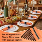 Introducing our Pre Rolled Orange Napkins with Black Plastic Silverware – the perfect way to impress your guests and take the stress out of hosting! With its convenient design, these pre-rolled black cutlery sets are both disposable and luxurious. Made from heavy-duty, 100% food-grade plastic, our cutlery is BPA-free and non-toxic, so you can be sure it's safe for your guests to use. We've designed our cutlery to replicate the look and feel of traditional utensils, providing a comfortable, anti-fall experience that your guests will love. This complete set includes an orange napkin wrapped in black plastic silverware, so you won't have to worry about washing cutlery and can focus on enjoying the festivities with your loved ones. The convenient pre-rolled design means that it's easy to set up and leaves a lasting impression. Our fancy disposable tableware with orange napkins is great for any party from birthday celebrations to Thanksgiving Halloween and other special occasions like fall harvest. Say goodbye to the hassle of washing individual utensils and hello to more quality time with family and friends. Package Include: Disposable Knife: 7.8 inches *30pcs Disposable Fork: 7.3 inches *30pcs Disposable Spoon: 6.9 inches *30pcs Orange Napkin: 15.8 x 15.8 inches *30 pcs Start impressing your guests today with the Pre Rolled Black Plastic Silverware with Orange Dinner Napkins! Complete Value Pack: Our designer black plastic cutlery set includes 30 pieces each of forks, spoons and knives, plus 30 orange dinner napkins for a complete dining experience at Thanksgiving fall harvest celebrate Halloween parties Made to Last: Crafted from food-grade materials, our pre rolled black disposable silverware is tough and sturdy, making it not easy to break or bend during use, perfect for handling even the toughest foods. Pre-rolled napkins make for easy clean-up Safe and Convenient: Made from non-toxic and BPA-free food-safe plastic, ensuring that it is safe to come in contact with any food. Our smooth-edged, high-quality disposable black silverware provides a comfortable and convenient dining experience Safe and Convenient: Made from non-toxic and BPA-free food-safe plastic, ensuring that it is safe to come in contact with any food. Our smooth-edged, high-quality disposable black silverware provides a comfortable and convenient dining experience Shining your table: These pre rolled plastic silverware black look like real metal cutlery, shining your table setting with our black pre wrapped plastic silverware set at any party theme, adding an elegant atmosphere to your party and impressing to your guests Easy to clean: This orange disposable cutlery set can be easily disposed for quick party clean-up, simply dispose of the rolled napkins with cutlery after use, more convenient and save your hands from food residue and grease, making you enjoy your fun dinning time.