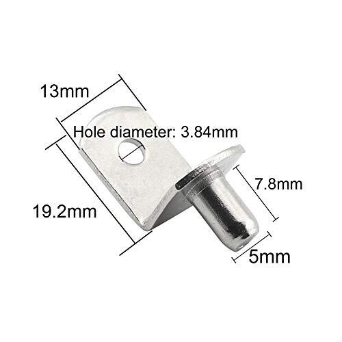 Pin diameter: 5mm Pin length: 7.8mm Material: Cold rolled steel with nickel plated Color: Silver-tone ●Fit for 5mm hole, please make sure the size you need before you buy it ●Widely used in cabinets, wardrobe, closet, bookshelf, shoebox, and racks ●Easy to Use - Just install or uninstall it by hand, good choice for DIY ●Each shelf support peg with a 3.84mm mount hole to permanently secure the shelf (not included mount screw) ●Note: Small parts, please stay away from your baby and children Package included: 30 x Bracket Style Shelf Support Pegs How to use 1. Use an electric drill to punch hole, please use the 5mm drill bit. 2. Put the shelf pin in the hole. ●Warm note: If the hole diameter is bigger than shelf pin diameter, you can wrap a circle around it with scotch tape, and then put the shelf pin in the hole 3. Place the baffle on the shelf pin. Pin diameter: 5mm; Fit for 5mm hole; Pin length: 7.8mm; Color: Silver-tone; Note: Small parts, please stay away from your baby and children Made of cold rolled steel with nickel plated, rugged, not easy to break, durable, rust-proof, wear-resistant and corrosion-resistant L-Shaped design shelf support pegs, can engages the side of the shelf, forcing the pins to remain in the holes Each shelf support peg with a 3.84mm mount hole to permanently secure the shelf (not included mount screw) For a tight fit effect, the holes diameter should be equal to or slightly smaller than the pin diameter (slightly less than or equal to 5mm); Please make sure the size you need before you buy it