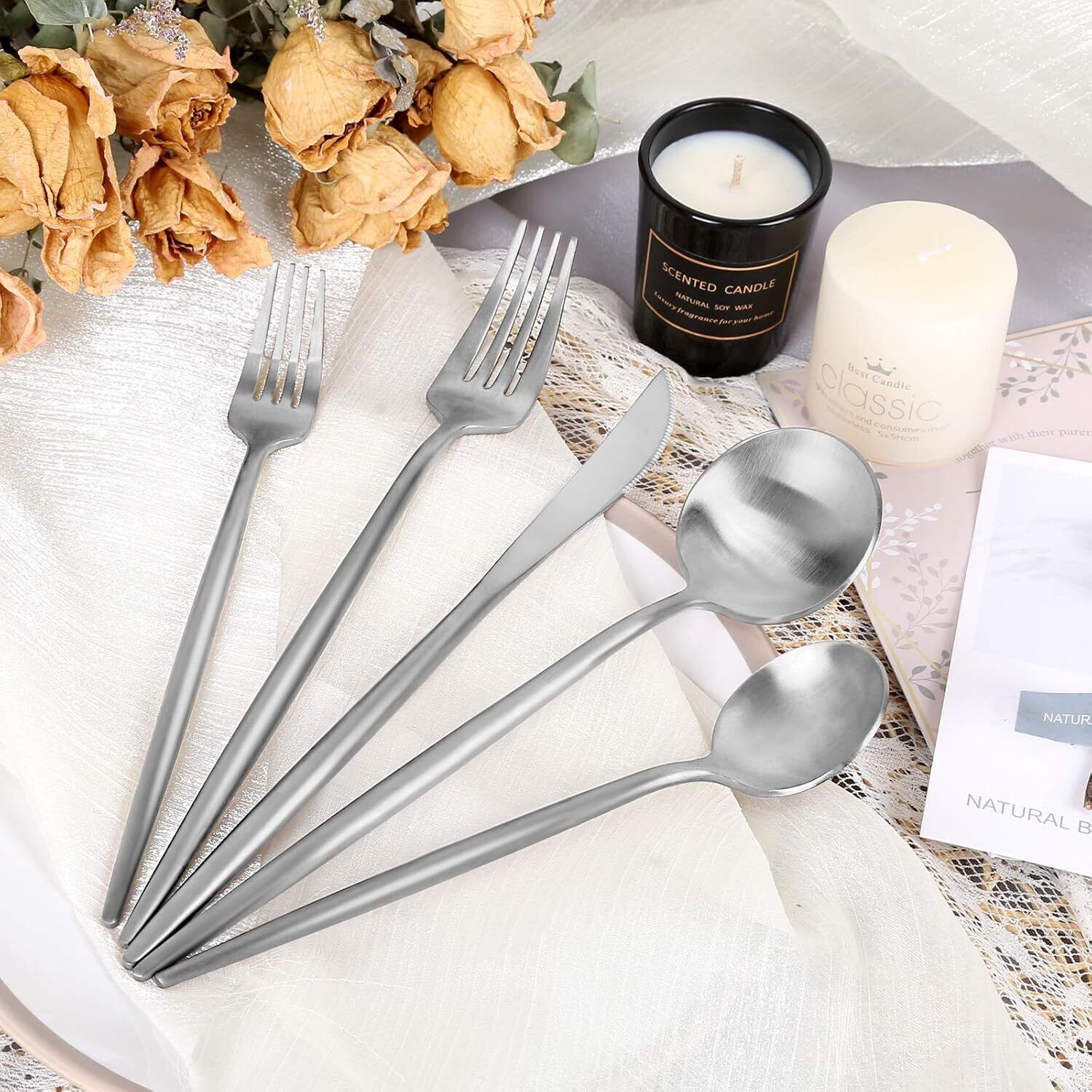 Number of Pieces 30 Material Stainless Steel Color Matte Silver Product Care Instructions Dishwasher Safe Recommended Uses For Product Indoor Special Feature Dishwasher Safe Finish Type Polished Included Components 6 x Dinner Forks, 6 x Knives, 6 x Dinner Spoons, 6 x Tea Spoons, 6 x Salad Forks Item Weight 3.3 Pounds See less About this item 🍴30 Pieces cutlery set service for 6---Each set includes: 6 salad forks, 6 dinner forks, 6 knives, 6 soup spoons, and 6 dessert spoons. 🍴Superior 18/0 Stainless Steel--This flatware set has 18/3 Stainless Steel fabrication that is immune to corroding, warping or flexing. When you commit your money in dinner knife you are making an investment in tableware that will serve your kitchen for a long time. This set with a finely polished satin finish and has a reliable, enduring construction for an exceptional comfort in use. 🍴This silverware set will add some style to your dining table purchasing this economic tableware that isn’t breaking under regular everyday use! Features 18/0 stainless steel construction with a finely polished chrome finish. A three-pronged design allows for an essential use with nearly any appetizer. This item has a reliable, enduring construction for an exceptional comfort in use. 🍴Sleek design for formal and causal use--With slim profiles and pointed stems, the FAMEWARE Flatware is a sophisticated take on minimalist design. The set includes everything you need for a formal full-course meal, but the reliable stainless steel and dishwasher-safe design makes it perfect for everyday dining too. 🍴Your appropriate care will make the silverware sets always look as good as new, please don’t use iron wire to scratch the pieces to keep their smooth surface. Number of Pieces 30 Material Stainless Steel Color Matte Silver Product Care Instructions Dishwasher Safe Recommended Uses For Product Indoor Special Feature Dishwasher Safe Finish Type Polished Included Components 6 x Dinner Forks, 6 x Knives, 6 x Dinner Spoons, 6 x Tea Spoons, 6 x Salad Forks Item Weight 3.3 Pounds Is Stain Resistant Yes Is Dishwasher Safe Yes UPC 787803790276 Package Dimensions 9.76 x 3.54 x 2.28 inches Item Weight 3.3 pounds