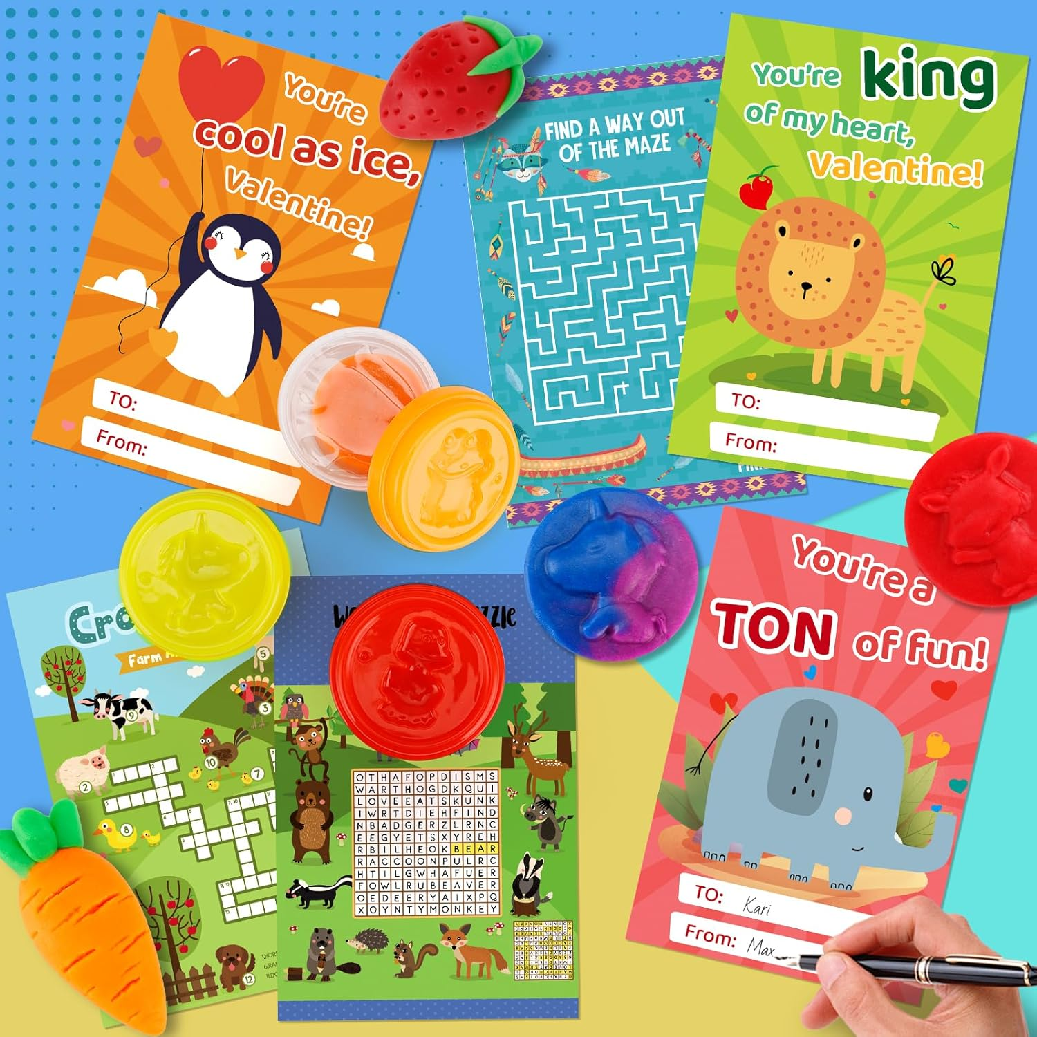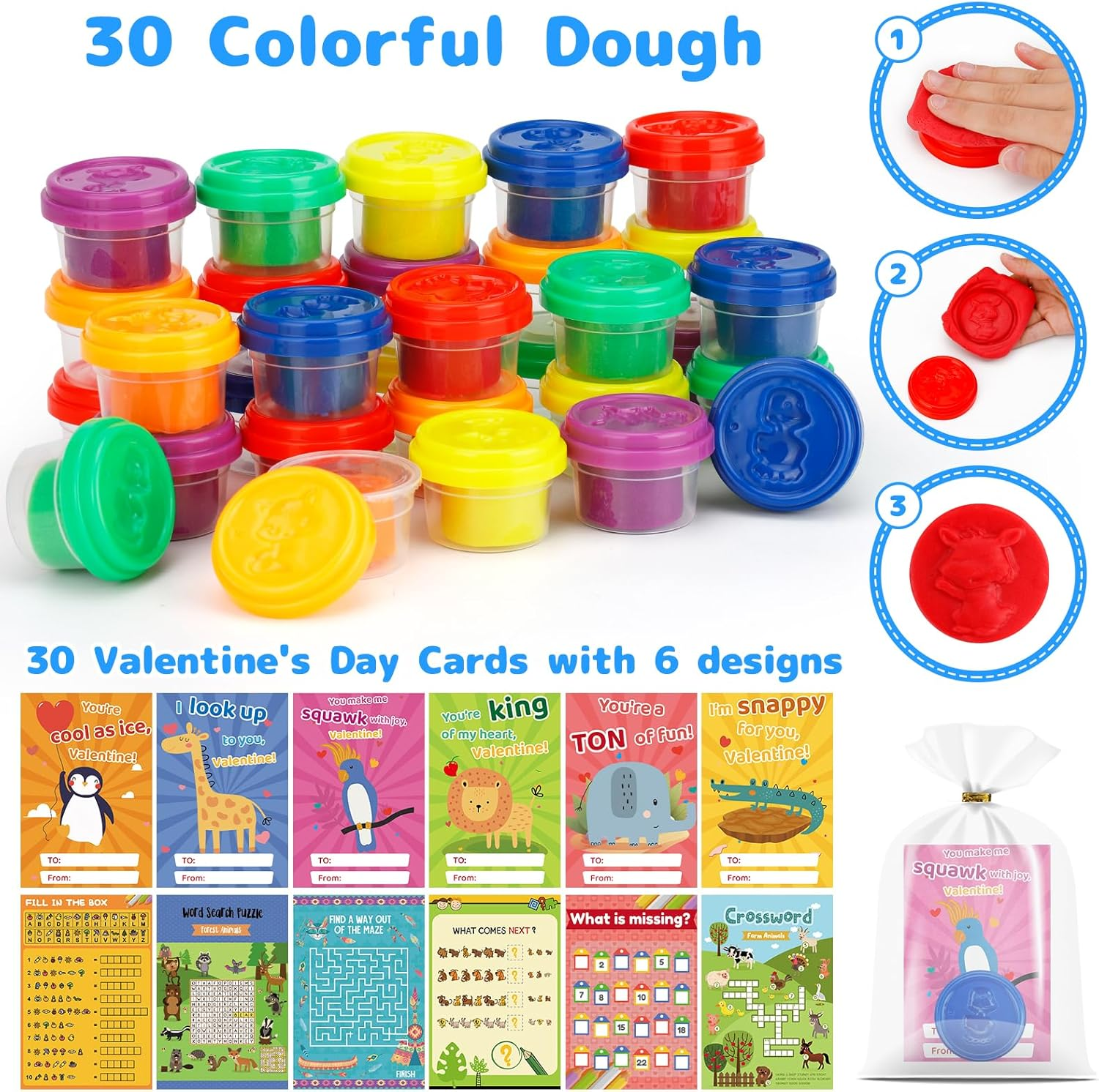 Fun and Creative Valentine's Set: This set includes 30 Punny Valentine's Day Cards and 30 colorful playing dough tubs, offering kids hours of creative fun while making Valentine’s Day extra special. Unique and Playful Cards: The pun-filled Valentine’s Day cards feature charming designs that are perfect for kids to share with friends, spreading joy and laughter. Versatile for Various Occasions: Ideal for classroom gift exchanges, party favors, and prizes, this set is a great choice for teachers, parents, and students seeking hassle-free Valentine’s Day solutions. Premium Quality Materials: The playing dough is soft, durable, and easy to mold, while the cards are made from sturdy, high-quality cardstock, ensuring safety and long-lasting use. Non-Candy and Engaging Gift Option: A healthier alternative to candy, the playding dough inspires creativity and keeps kids entertained, making it a hit for all ages and a thoughtful Valentine’s Day gift! Product Description