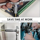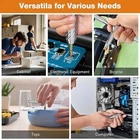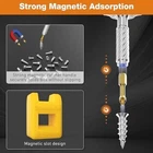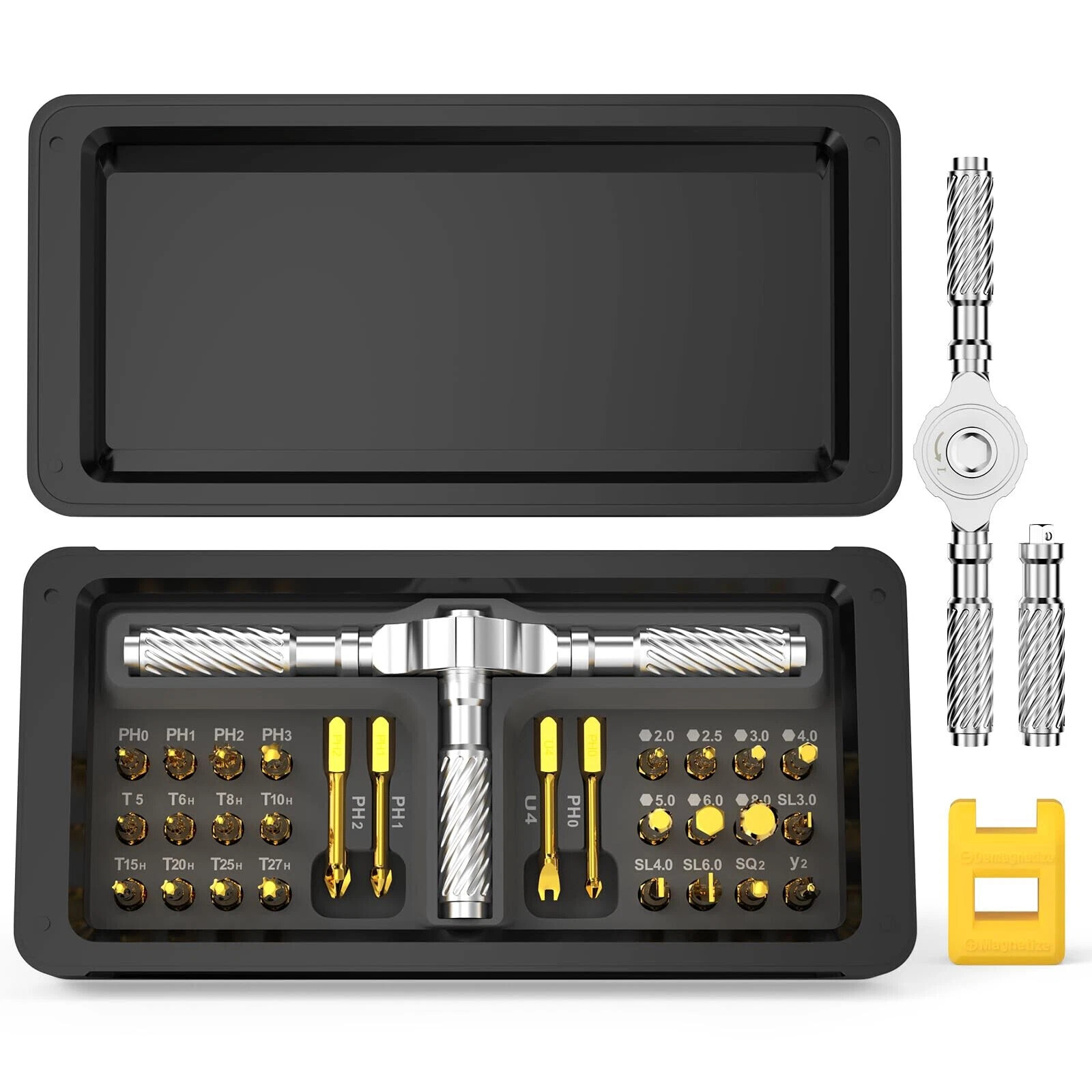 💯30-in-1 Magnetic Ratchet Screwdriver Set: This professional-grade ratchet screwdriver set comprises 28 high-precision steel bits, encompassing PH, SL, Torx, Hex, and U types.It also comes with a T-shaped handle and a yellow magnetic slot with magnetic properties. 🚀Durable & Portable: Housed in a reinforced ABS case with custom foam slots, this compact and travel-ready magnetic ratchet screwdriver set resists drops and corrosion. Each bit is clearly labeled for quick identification, allowing users to conveniently store the set in a backpack or glove compartment for emergency use. ⚡Ultra-Lightweight & Ergonomic Design: Screwdriver are constructed from durable S2 chrome molybdenum steel, the screwdriver offers exceptional strength and longevity. The T-shaped ratchet handle is crafted from lightweight aluminum alloy, weighing only half as much as a steel tool while maintaining twice the durability. Its ergonomic design and non-slip grip reduce wrist fatigue by up to 70%, making it suitable for extended use in applications such as computer repair, bicycle maintenance, or household appliance servicing. 🆙Advanced Ratcheting Mechanism: Equipped with a precision-engineered 58-tooth reversible ratchet mechanism and a 6.2° rotation angle, this multi-functional screwdriver set delivers 50N.m of torque for effortless tightening and loosening. The instant forward/reverse mode switching makes it an ideal choice for both professionals and DIY enthusiasts working in tight spaces. 🎁Ideal Gift for Tool Enthusiasts: From gadget repairs to automotive maintenance, this versatile ratchet screwdriver set serves as an excellent gift for engineers, hobbyists, or anyone passionate about tools. Its sleek black design combines functionality with aesthetics, making it a valuable addition to any toolbox. Product Description Previous page Next page 1 Magnetic Packaging 2 Prdoduct Size 3 6.2° Ratchet Design