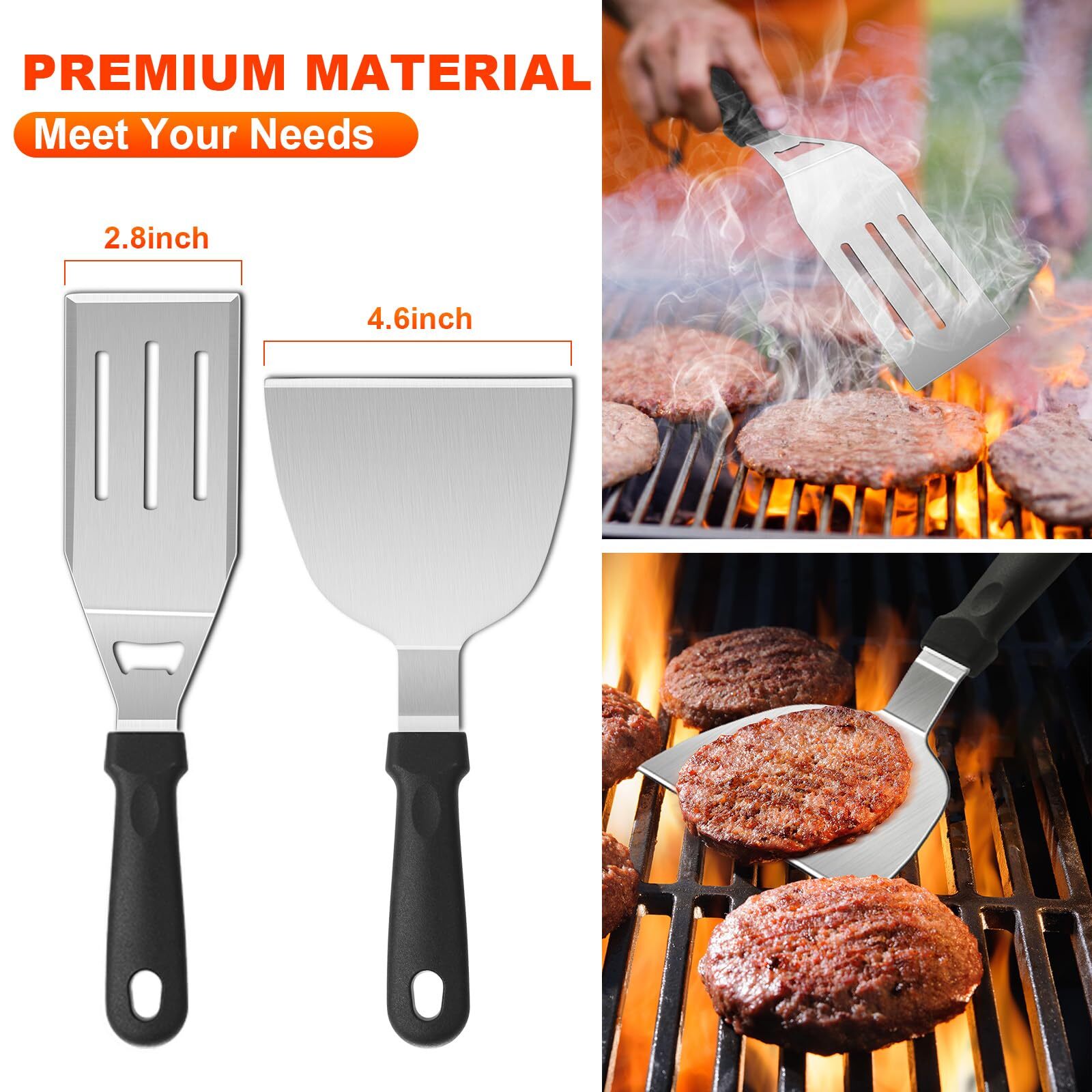 Griddle Accessories Kit, 30PCS Flat Top Grill Accessories Kit for Blackstone and Camp Chef, Stainless Steel Griddle Grill Tools with Enlarged Spatulas, Scraper, Tongs, Carrying Bag for Outdoor BBQ Super Value Griddle Accessories Kit: Our complete 30PCS Griddle Accessories Kit for Blackstone includes everything you need for outdoor or indoor grilling. It contains 1 Slotted Spatula, 1 Long Griddle Spatula, 1 3-Sided Bevel Spatula, 1 Scraper, 1 Chopper, 1 Burger Scraper, 1 Fork, 1 Grill Tongs, 1 Fish Turner, 1 Basting Brush, 2 Spice Shakers, 4 Egg Rings, 2 Squeeze Bottles, 1 Cleaning Brush, 1 Storage Bag, 10 Hooks. Premium Stainless Steel: Our grilling accessories set is made of high quality stainless steel ensure the griddle accessories compatible with Blackstone griddle, which is bpa free, rust proof and durable, you can use it with confidence, without worry about your tools bending or breaking. The heat-resistant ABS handles provide a comfortable grip, with hanging holes for easy storing. Furthermore, this metal flat top grill accessories are easy to clean and dishwasher safe. Chef's Choice Griddle Tools: Our grill tools set with griddle scraper, spatulas and oil bottles are necessary griddle tools for griddle chef. The Long Griddle Spatula can move large amounts of food quickly and accurately. Flattop grill flipper/turner with 3-sided bevel cutting edge, perfect for flipping burgers, pancakes, veggies, cutting bread, meat and sausage. Holes of the slotted spatula help drain excess grease or oil off of cooked meat. Extra BBQ Tools: Egg Ring can shape your eggs in different shapes that is more delicate; Cleaning Brush can help you remove stubborn stain after cooking.our spice shakers has larger capacity, it’s more convenient to use. Everything help you conquer flat top grilling like a master. Each tool can be placed orderly in the compact storage bag, it’s easy to store and convenient to take to backyard park outdoor camping or daily using in kitchen. The Practicality Tool You Need: Our barbecue tools include all the tools needed for yard, outdoor, and camping barbecues. It is a good helper to help you explore the food journey. griddle accessories kit is a professional indoor and outdoor BBQ grill tools set created for cooking enthusiasts and chefs. Take a break on your garden, lawn or any outdoor from your busy life with Blackstone Griddle Accessories Kit. The complete 30pcs griddle grill tools could meet all your needs for barbecue griddle cooking, help you conquer flat top grilling like a master. PRODUCT FEATURES: 【Thick & Solid Stainless Steel】Rust-free, durable and strong enough to resist deformation. The heat resistant ABS handles provide a comfortable grip, with hanging holes for easy storing. 【Different Spatula Set】 Multi-purpose griddle spatulas meet all your BBQ grilling needs. 【Easy to Carry Storage Bag】The custom canvas carrying bag is much convenient for you to carry when you have a picnic or camping. 【Easy to Clean & Dishwasher Safe】All tools are easy to clean, and also can be put into the dishwasher, saving your time. PACKAGE INCLUDES: 2 Oversized Griddle Spatulas 1 Regular-size Grill Flippers/Turners 1 Fish Turner & 1 Burger Turner 1 Chopper & 1 Slant Edge Scraper 1 Griddle Tongs (13.6inch) & 1 Grill fork 2 Leak-free Squeeze Bottles 4 Egg Rings & 2 Spice Shakers 1 Basting Brush & 1 Soft Cleaning Brush 10 Stainless Steel Hooks 1 Sturdy Storage Bag WARM TIPS Please clean these tools immediately after use, and wipe off the surface moisture with a dry cloth for long-term use. SHIPPING Domestic Buyers - We ship within 3 business days of payment, usually sooner - We offer FREE shipping on all orders! - We only ship to the lower 48 states, no APO/FPO addresses or PO Boxes allowed - We have confidence in our products, but if you are not fully satisfied please contact us within 30 days of purchase and you will get full refund. International buyers – please note: Import duties, taxes, and charges aren't included in the item price or postage cost. These charges are the buyer's responsibility. - Please check with your country's customs office to determine what these additional costs will be prior to bidding or buying. Return Policy - This product comes with 30-Days Money Back Guarantee. - If you receive an item and it doesn't work properly or you don't like it because of any reason at all, - we have a 100% refund/return policy. We will ship you a new item or refund your money for the full sale amount. - For all returned products, buyers MUST contact us for the returning address. * Order Cancellation Policy ** You can return a product for up to 30 days from the date you purchased it. 1. The seller reserves the right to cancel the special case only due to eBay cancellation fee. 2. The decision of seller is the final. 3. The seller will respond to the cancellation request within 2 business days. Please wait for the result of cancellation. 4. In case the cancellation is not completed by some reasons, the buyer can follow the options below to get the refund. 4.1 The buyer can reject the item when it arrives. 4.2 The buyer can send the item back to the seller within 30 days If the buyer receives item (USA Shipment ONLY). The seller will provide the FREE return label to the buyer when the buyer opens " Return Item" case on eBay by using the reason as "Change my mind" ONLY. 5. When buyer has placed the order. The order will be processed and completed by automatic warehouse system within 5 minutes. In case that buyer sends the cancellation request after 5 minutes of placing the order, the request will be rejected. **Sending direct message to cancel the order is not allowed for every case.* Return Policy For the return case - If buyer would like to return the items for refund or replacement, please CONTACT SELLER to receive the free return label from seller. The refund or replacement will be processed with the tracking number of return label which is provided by seller onl