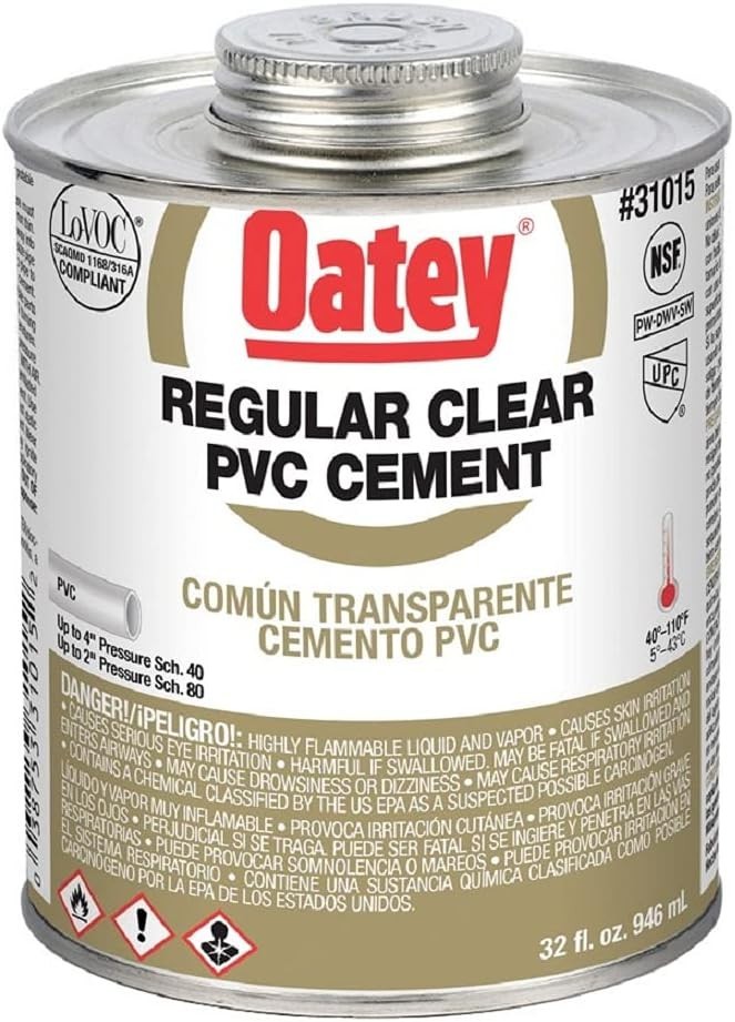 31015, 32 oz, Clear 31015, 32 oz, Clear Hydraulic Cements Regular-Bodied Clear cement for use on all schedules and classes of PVC pipe and fittings up to 4-Inch for Sch. 40 and up to 2-Inch for Sch. 80 Solvent Cement meets California South Coast Air Quality Management District (SCAQMD) 1168/316A or BAAQMD Method 40 and various environmental requirements Recommended for potable water, pressure pipe, conduit and DWV Recommended application temperature 40°F to 110°F / 4°C to 43°C Regular-Bodied Clear cement for use on all schedules and classes of PVC pipe and fittings up to 4-Inch for Sch. 40 and up to 2-Inch for Sch. 80 Solvent Cement meets California South Coast Air Quality Management District (SCAQMD) 1168/316A or BAAQMD Method 40 and various environmental requirements Recommended for potable water, pressure pipe, conduit and DWV Recommended application temperature 40°F to 110°F / 4°C to 43°C Meets ASTM D-2564 -31015, 32 oz, Clear From the Manufacturer products can be found in residential and commercial applications and have achieved excellent product name recognition with consumers. All products are backed with the highest quality technical and customer support programs in the industry