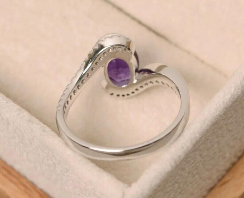 This elegant bypass promise ring features a 3.10Ct oval simulated Amethyst stone set in 14k white gold plated sterling silver. The ring is designed with a solitaire style and a bypass band, creating a unique and stylish look. The main stone color is purple, with a main stone width of 10 mm and a length of 12 mm. It is adjustable to fit all ring sizes and can be personalized as per the buyer's requirements. This handmade ring is nickel-free and engraved, making it a perfect choice for occasions like engagements, anniversaries, birthdays, and more.