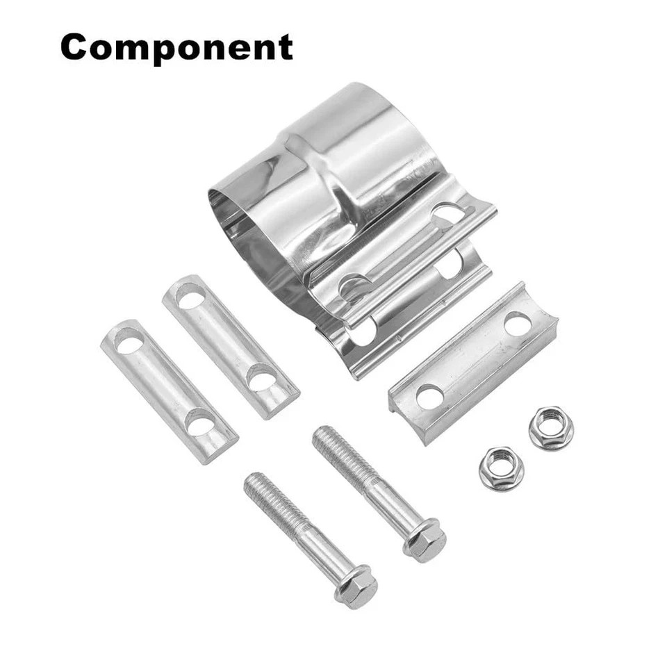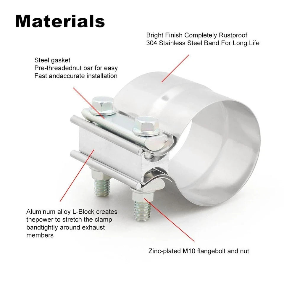 Clamp Size: joins 3.5 inches OD pipe to 3.5 inches ID pipe, width of strap: 3 inches /76mm clamp, 2 Pcs per package Clamp Material: 304 stainless steel band, zinc-plated M10 flange bolt and nut, steel gasket, aluminum alloy I-block Product Clamp Application: Lap joint clamp is a simple, effective way to connect exhaust system components such as exhaust pipes connect, exhaust pipe tail throat connect , mufflers connect, catalytic converters connect etc Product Advantage: stainless steel materials is good corrosion resistance, easy to install or remove product, no welding design Product Feature: this band clamps make the force of 360 evenly distributed, provides a good seal and prevents material deformation
