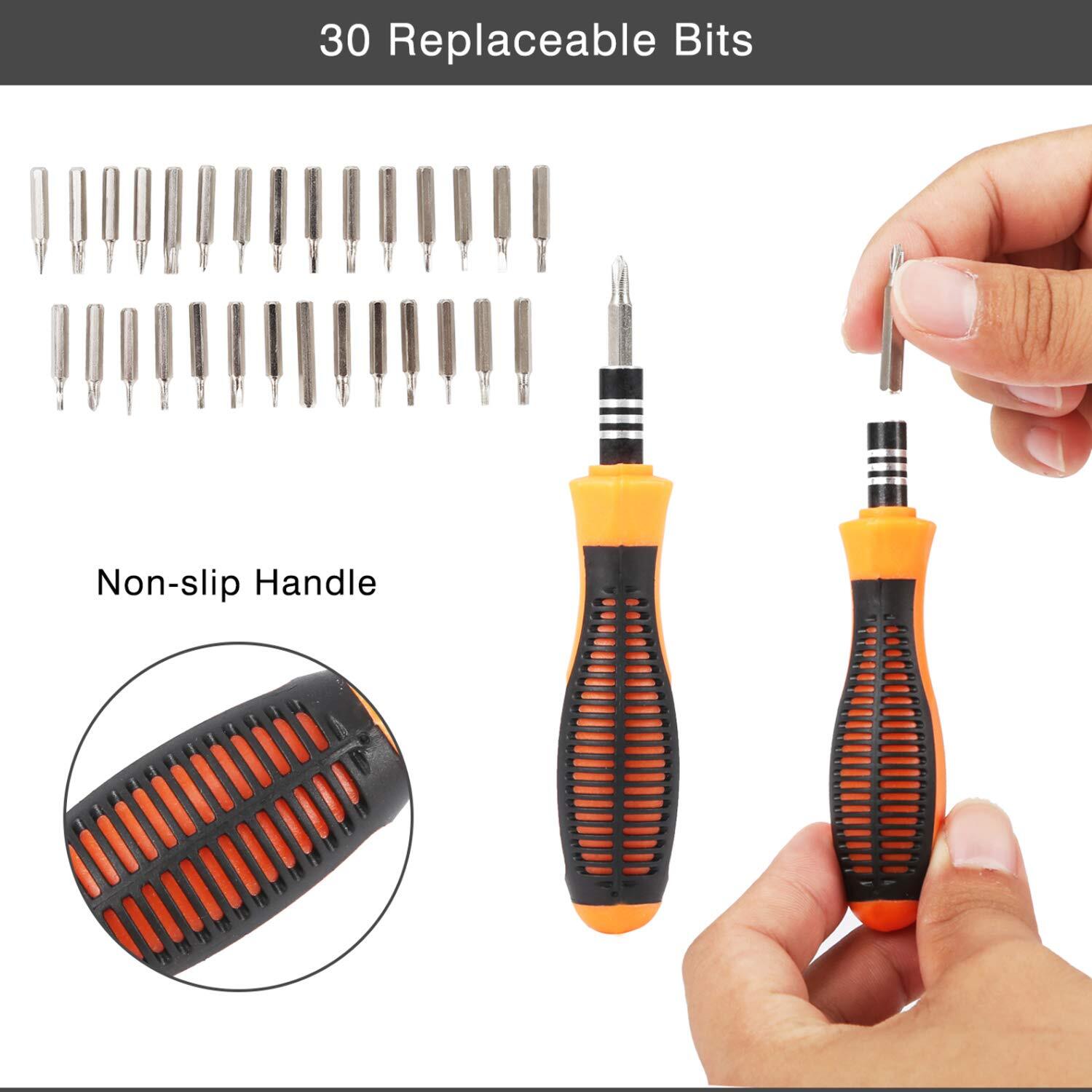 🔧 High Quality & 30 Differerent Bits: Made of strong and durable chrome-vanadium steel, you have no need to worry about rusting. 30Types Bits: Torx( 4,5,6,7,8,10,15,20), Hex( 1.5,2.0,2.5,3.0,3.5,4.0), Slotted( 1.3,1.5,2.0,2.5,3.0,3.5,4), Phillips( 00,0,1,2), Tri-wing( 2.0,3.0), Triangle(3.0), Pentalobe/Star( 1.5), U-type( 2.6). 🔧 Widely Use Repair Tool Kits: Perfect repairing tools compatible with iPad, iPhone, Tablets, Laptops, PC, Smartphones, Watches, Glasses, Camera PS4/Xbox controller and Other Electronic Devices, as well as home appliances and auto repairs. 🔧 Strong Magnetic Screwdriver: The driver has a magnet in the end of the receiving socket, which helps to pull the bit into place, and they can tighten the screws during repair. Highly improve the performance and saves your time and effort. 🔧 Compact & Portable Screwdriver Set: 5.2 x 2 inches. Comes with small sized handle allow you to access hard to reach narrow areas. Non-slip ensures greater comfort and convenient. 🎁 Great Gift Tool Set: The screwdriver set has instructions on the box, it is easy to find the bits which you want. It is also can be a practical gift to send boyfriend, father, or diy lover.