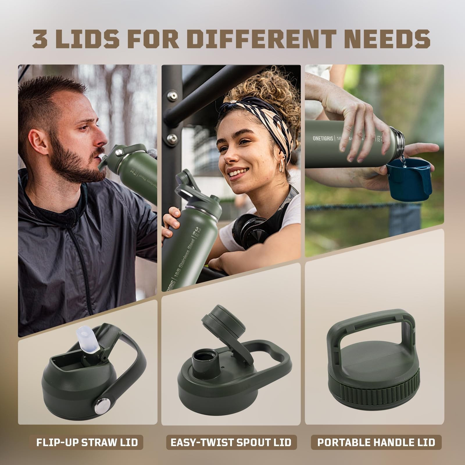 24 Hrs Hot, 48 Hrs Cold: Tactical Insulated Water Bottle features double-layered 304 stainless steel construction, keeping drinks hot for 24 hours and cold for 48 hours. Stay hydrated on-the-go and conquer outdoor adventures with ease 360° Leak-Proof Design: This leakproof water bottle features a 360° leak-proof design with edible-silicone seals inside every lid, ensuring no spills even when placed in a backpack or car, keeping your items dry and safe 3 Interchangeable Lids: The insulated water bottle comes with three different lids, catering to various beverage needs throughout your day. Easily switch between the three lids anytime, anywhere, enhancing your drinking experience Convenient& Versatile Water Bottle Kit: The water bottle kit includes 3 interchangeable lids, 2 straws, a straw cleaning brush, and a pouch for storing essentials like your and keys. This convenient set not only makes carrying the water bottle easy but also frees up your hands from juggling multiple bags when you're on the go. Just grab the water bottle set and head out effortlessly Easy Clean: The wide-mouth design of this water bottle allows for easy addition of fruits or ice cubes to your beverages, simplifies cleaning, and is dishwasher-safe for convenience. For optimal longevity and cleanliness, hand washing is recommended to preserve the bottle's quality and lifespan
