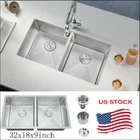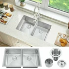 Product Description: The Nano Commercial grade brushed finish for easy to clean and long-lasting ,stainless steel with satin finish ensures that it is highly resistant to dirt and grime, easily wipes clean, and matches most kitchen appliances. Heavy duty sound guard undercoating and thick rubber padding to minimize noise and reduce condensation. Stainless steel basket strainer drain that traps goods waste and can be easily emptied into the trash. Not include Faucet. Features: 20 Gauge stainless steel thickness. 10mm radius corner for easy cleaning and modern look. Nano Commercial grade brushed finish for easy to clean and long-lasting. Heavy duty sound guard undercoating and thick rubber padding to minimize noise and reduce condensation. Slanted bottom with elegant drain grooves for easy water draining. USA standard 3.5'' drain opening will fit any garbage disposal unit. Drain placement – Rear drain placement ensures dishes don't settle on the drain. Product Dimensions: 32 x 18 x 9 inch Double Bowl Accessories: Strainer Cut-out template paper Installation mounting brackets hardware Package: Foam corner guard+7 layers stronger carton