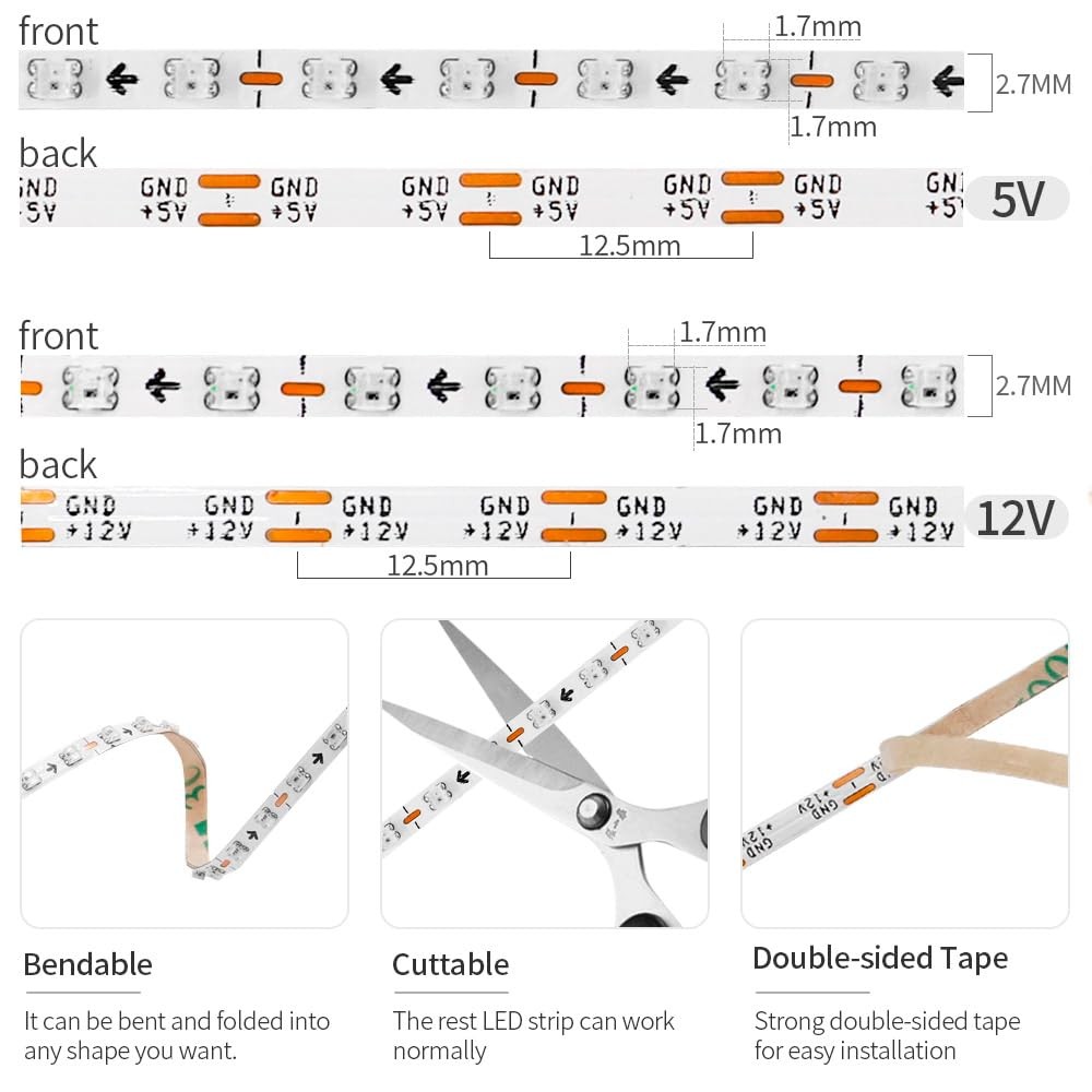 Products Description: Product Name:Ultra Narrow WS2812 Smart Digital LED Strip IC Chip:WS2812B SMD Size: 2020SMD Voltage :DC5V Color:Addressable RGB full color LED Qty:160 LEDs/m PCB width:2.7mm Watts:6w/m Cutted:Per 2 led PCB color:White IP rated:IP20;non-waterproof Pins:3 Wires = 5V+(Red wire), DATA(Green wire), GND(White wire) Operation temperature: -20℃-+45℃ Storage temperature: -20℃-+60℃ View angle: 180° 【Ultra Narrow】The 2.77mm width individually addressable LED strip making them easier to install in tight spaces or on curved surfaces. WS2812B+IC Built-in 2020SMD.LED strip is compatible with SP611E, SP511E, SP105E, SP108E and other music/WIFI APP Pixels controllers. 【Cuttable】Addressable neon LED strip.The interval between the two Cut Mark measures 0.49in(12.5mm).After cut,the rest LED strip can worknormally(Since the light strip is super narrow, don't bend it sharply to avoid breaking!) 【Easy to Install】The LED strip comes with a strong self-adhesive backing, making installation quick and hassle-free. Simply peel off the protective film and stick it to any clean and dry surface. Enjoy instant and effortless installation without the need for additional tools or accessories. 【Versatile Applications】Dream full color programmable LED strip is perfect for a wide range of indoor applications. It can be used to create a cozy atmosphere in bedrooms, illuminate stairs, brighten up living rooms, and add a touch of ambiance to kitchens and bars. It can also be utilized to enhance the aesthetics of wardrobe, display shelves,car,game rooms, and as a TV backlight, bringing a vibrant and dynamic element to your space. 【Tips】When the light strip is in white light, it will gradually change from white light to orange light. This is caused by insufficient voltage. You only need to increase the voltage to solve it.The DC5V light strip needs a DC5V power supply, if it is greater than DC5.5V, the light strip will be damaged! Power supply and controller are not included in the package.