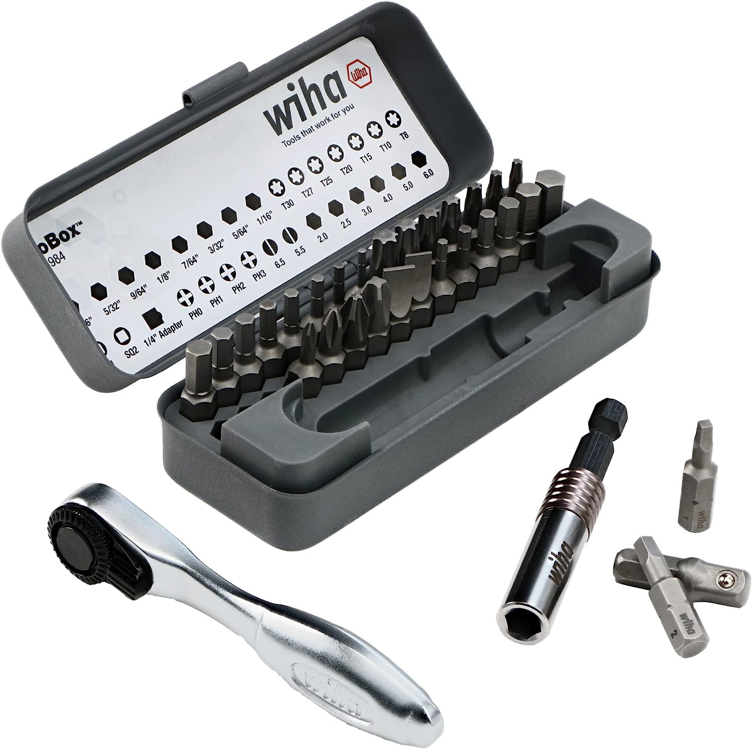 Steel Set Includes: Phillips #0, #1, #2, #3 | Slotted 5.5, 6.5mm | Square #1, #2 | Torx T8, T10, T15, T20, T25, T27, T30 | Hex Metric 2.0, 2.5, 3.0, 4.0, 5.0, 6.0mm | Hex Inch 1/16, 5/64, 3/32, 7/64, 1/8, 9/64. 5/32, 3/16" Standard 1/4" Hex to 1/4" Square drive for universal application 72 tooth ratchet system with 5° arc swing for smooth ratcheting in tight spaces Conveniently stored in a pocket-sized metal case for easy storage and security Computer-controlled heat treatment for a new standard in bit performance Exact fit precision machined tips for reduced cam-out Fast action thumb lever for quick rotation change CVM premium quality tool steel for strength and durability Bit Holder 1/4" x 2.625" Bit Ratchet 1/4” x 3.5"/90mm 32 PC Standard Bit Set in Box Items In Set More Details Wiha 32 Piece Standard Bit GoBox features a collection of 1-Inch impact-rated bits in a wide variety of tip profiles including phillips, slotted, square, torx, hex-Inch, hex-metric, and a 1/4-Inch Hex to 1/4-Inch square drive adapter. Wiha standard bit box comes with a smooth-turning 72-tooth reversible mini-ratchet that can access tight spaces other tools can't. The mini-ratchet accepts 1/4-inch hex drive bits, 1/4-inch sockets with the included hex-to-square drive adapter, and a 1/4-inch drive locking magnetic bit holder. The standard Wiha bit GoBox comes with a custom-fit molded tray for easy organization and a pocket-sized metal case for secure and convenient transport in any scenario. With Wiha standard bits you get the tightest-fit precision driver tips from the company that is the standard for precision in the industry. Wiha's exact-fit tips eliminate excessive bit-wobble resulting in a highly stable engagement with the screw head, reducing fastener cam-out that can lead to injury or damage to finished materials. Set Includes: Phillips #0, #1, #2, #3 | Slotted 5.5, 6.5mm | Square #1, #2 | Torx T8, T10, T15, T20, T25, T27, T30 | Hex Metric 2.0, 2.5, 3.0, 4.0, 5.0, 6.0mm | Hex Inch 1/16, 5/64, 3/32, 7/64, 1/8, 9/64. 5/32, 3/16" Standard 1/4" Hex to 1/4" Square drive for universal application 72 tooth ratchet system with 5° arc swing for smooth ratcheting in tight spaces Conveniently stored in a pocket-sized metal case for easy storage and security Computer-controlled heat treatment for a new standard in bit performance Exact fit precision machined tips for reduced cam-out Fast action thumb lever for quick rotation change CVM premium quality tool steel for strength and durability Bit Holder 1/4" x 2.625" Bit Ratchet 1/4” x 3.5"/90mm