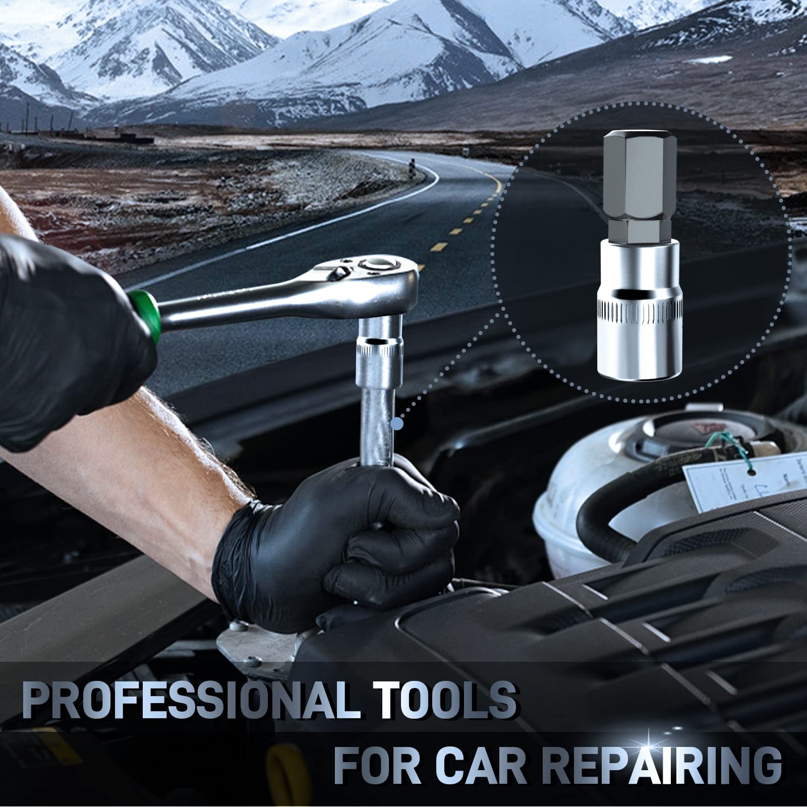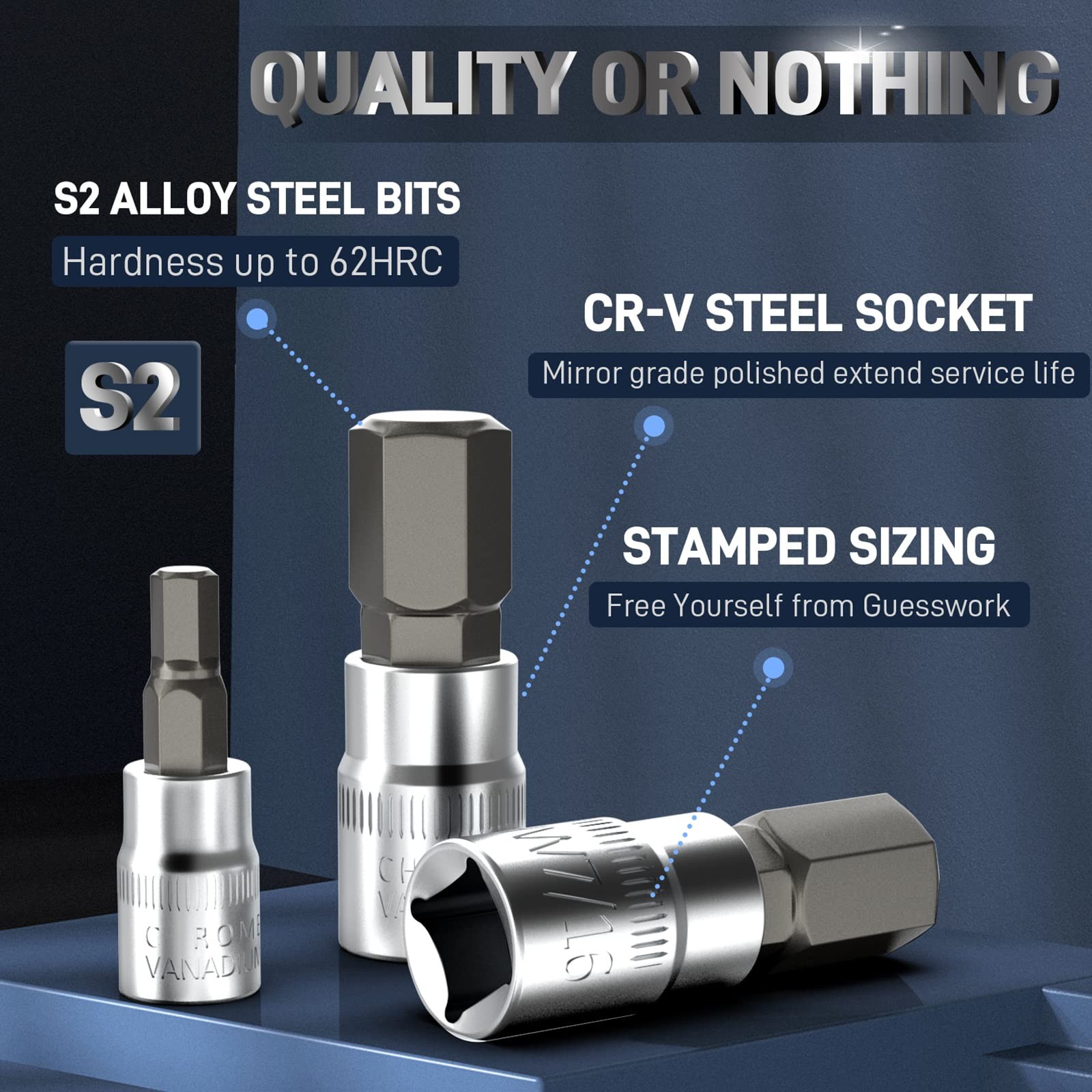 32-Piece HEX Bit Socket Set, SAE & Metric Allen Wrench Socket Set with Enhanced Storage Case, Premium Heat Treated Chrome Vanadium Steel & S2 Alloy Steel 【Premium Material】32PC Hex Bit Socket Set are made of premium heat treated Chrome Vanadium Steel on torx socket end and heat treated S2 Alloy Steel on hex bits, a high quality material with high durability and maximum strength, and provide greater torque. Chrome plated on the surface for anti-corrosion and rust prevention 【SAE & Metric Size】32 Pieces Hex Bit Socket Set provides both SAE and Metric size options: 16pc SAE HEX: 1/4 inch drive (5/64", 3/32", 1/8", 5/32", 3/16", 7/32", 1/4"), 3/8 inch drive (9/32", 5/16", 3/8", 7/16", 1/2"), 1/2 inch drive (9/16", 5/8", 11/16", 3/4"). 16pc Metric HEX: 1/4 inch drive (2, 2.5, 3, 4, 5, 5.5, 6mm), 3/8 inch drive (7, 8, 9, 10, 12mm), 1/2 inch drive (14, 15, 17, 19mm) 【Portable Storage Tool Case】Each hex bit socket is tightly packed in a portable and well-packaged storage tool case, convenient for carrying. Sizes are stamped permanently on each socket so that you can easily get the size you need 【Precise Tightening】These must-have allen wrench sockets can be inserted into any torque wrenches or impact driver tightly and precisely with the chamfered bit ends. You can use them for auto repair, and household appliance maintenance 【Quality 】Each hex bit socket has been tested strictly to meet the industry standard of hardness, torque and surface. They are durable and should last for with normal use.If you have any questions for set, please feel free to anytime.