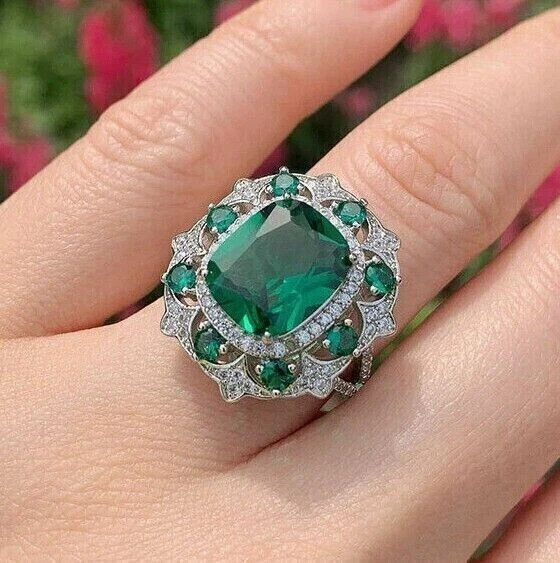 This beautiful ring is the perfect choice for those looking for a unique and elegant piece of jewelry. With a 3.35Ct cushion-shaped simulated emerald as the main stone, surrounded by a halo of simulated diamonds, this ring is sure to catch the eye. The ring is crafted from 14k white gold-plated sterling silver and features a band width of 4.5mm. The ring is available in all sizes and can be personalized to suit the buyer's requirements. It is perfect for a variety of occasions including weddings, anniversaries, birthdays, and Valentine's Day. The ring is nickel-free and engraved with a prong setting style. The seller offers a warranty on the ring, ensuring its lasting beauty and value.