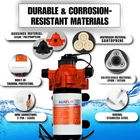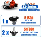 ✔️ [ SPECIFICATIONS ]: ✔️Model Number: SFDPA1-033-045-33 ✔️Voltage: 115V ✔️Open Flow: 3.3 GPM (12.5 LPM) ✔️Shut-Off Pressure: 45 PSI (3.1 BAR) ✔️Max Draw: 1.0A ✔️Priming Capabilities: 6 feet (1.8 m) suction lift ✔️Material: Santoprene (Diaphragm) / EPDM (Valves) ✔️Ports: 1/2"-14 MNPT ✔️Max Recommended Temperature: 140°F (60°C) ✔️Warranty: 4-Year Limited Warranty✔️ UL 778 & CSA 22.2 Certified ✔️ [ INCLUDED COMPONENTS ]: ✔️SEAFLO 33-Series Diaphragm Pump ✔️Installation Instructions ✔️(2) 1/2" Barbed Hose Adaptors ✔️50 Mesh Inlet Strainer ✔️Mounting Hardware ✔️Wall Plug for Easy Setup ✔️ [ HIGH-PERFORMANCE THREE-CHAMBER DESIGN ]: The SEAFLO 33-Series features a robust three-chamber diaphragm capable of delivering a reliable flow rate of 3.3 GPM. This design supports up to 3-4 fixtures simultaneously, making it perfect for freshwater or saltwater applications in marine, RV, and household settings. ✔️ [ SELF-PRIMING AND RUN DRY CAPABILITIES ]: Designed for versatile installation, this pump offers a 6-foot self-priming lift, allowing it to be mounted above the water source without performance loss. It can also run dry without damage, ensuring durable operation even during low-water situations. ✔️ [ AUTOMATIC ON-DEMAND OPERATION ]: The pump's built-in automatic pressure switch provides on-demand operation, activating when a faucet is opened and shutting off when closed. This feature saves energy and optimizes water usage, enhancing the efficiency of your water system. ✔️ [ DURABLE & CORROSION-RESISTANT MATERIALS ]: Built with high-quality Santoprene and EPDM, this pump offers excellent resistance to abrasion and corrosion, making it ideal for both freshwater and saltwater environments. The durable materials ensure long-lasting reliability under harsh conditions. ✔️ [ QUIET OPERATION WITH ANTI-VIBRATION DESIGN ]: The SEAFLO 33-Series pump is engineered for quiet operation, with noise levels comparable to an indoor electric fan. The semi-rigid rubber mounting base reduces vibration, minimizing noise and ensuring peaceful usage in confined spaces like RVs, boats, and cabins. ✔️ [ VERSATILE APPLICATIONS FOR MARINE, RV, AND HOME USE ]: Ideal for multiple applications, this pump supports washdown, potable water, and household water transfer needs. Its high flow rate and reliable build make it a versatile solution for various settings, from camping to marine adventures. ✔️ [ EASY PLUG-IN INSTALLATION WITH WALL OUTLET ADAPTER ]: For added convenience, this pump includes a plug for a standard wall outlet, simplifying setup and making it easy to integrate into any water system, whether on the road, at home, or out on the water. Product Description SEAFLO 33-Series 115v Water Diaphragm Pump is the ultimate solution for reliable and efficient water flow in your RV, marine, or boat system. This advanced three-chamber diaphragm pump offers high-performance with up to 3.3 gallons per minute (GPM) and water flow for up to 3-4 fixtures. 33-Series Technical Specifications Robust Construction! Built to withstand the harsh conditions of marine and RV environments, the SEAFLO 33-Series pump features durable materials such as Santoprene for the diaphragm and EPDM for the valves. ese materials are known for their abrasion and corrosion resistance, ensuring the pump can handle both salt water. Versatile Applications: The SEAFLO 33-Series pump is not just limited to one function. It can be used as a salt or freshwater washdown pump, potable water system pump, shower drain pump, or other liquid transfer applications. Premium Product Features 33 Series vs Other SEAFLO Pumps Add to Cart Add to Cart Add to Cart Add to Cart Add to Cart Customer Reviews 4.3 out of 5 stars 3,263 4.4 out of 5 stars 1,436 3.6 out of 5 stars 25 4.4 out of 5 stars 2,039 4.2 out of 5 stars 879 3.9 out of 5 stars 98 3.8 out of 5 stars 9 Price $94.99 $ 94 . 99 — — $64.99 $ 64 . 99 $119.99 $ 119 . 99 $149.99 $ 149 . 99 $199.99 $ 199 . 99 Model Number SFDPA1-033-045-33 SFDP1-012-035-21 SFDP1-013-100-22 SFDP1-030-055-42 SFDP1-055-060-55 SFDP1-050-070-56A SFDP1-070-060-53 Open Flow (GPM/LPM) 3.3 / 12.5 1.2 / 4.5 1.3 / 5.0 3.0 / 11.3 5.5 / 20.8 5.0 / 18.9 7.0 / 26.5 Voltage 115 VAC 12V 12V 12V 12V 12V 12V Max Draw 1.2 A 4.0A 6.0A 7.0 A 17A 10A 24.5A Shut-off Pressure (PSI/BAR) 45 / 3.1 35 / 2.4 100 / 6.9 55 / 3.8 60 / 4.2 70 / 4.8 60 / 4.2 Priming Capabilities 6 feet (1.8 m) suction lift 4 feet (1.2 m) suction lift 6 feet (1.8 m) suction lift 6 feet (1.8 m) suction lift 9 FT (2.7M) suction lift 6 feet (1.8 m) suction lift 9 FT (2.7M) suction lift Max Recommended Temperature: 140° F (60° C) Max. 140° F (60° C) Max. 140° F (60° C) Max. 140° F (60° C) Max. 140° F (60° C) Max. 140° F (60° C) Max. 140° F (60° C) Max. Material: EPDM (Valves) EPDM (Valves) EPDM (Valves) EPDM (Valves) EPDM (Valves) EPDM (Valves) EPDM (Valves) Ports: 1/2"-14 MNPT Threaded 3/8" hose Barb 3/8" hose Barb 1/2"- MNPT Threaded 1/2"-14 MNPT Threaded Quick Attach Quick Attach Fixtures Quantity: 3-4 1 1 Up to 4 Up to 6 Up to 6 Up to 8 Duty Cycle: Intermittent Intermittent duty Continuous Duty Continuous duty Intermittent Intermittent Continuous Duty