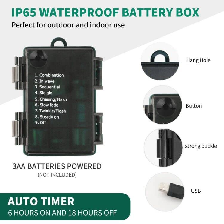Technical Specifications: Light Color: Warm White, White, Multi-Color Application: Indoor/Outdoor LED Quantity: 100 LED String Length: 33ft / 10m Work Mode: 8 lighting modes Waterproof Rate: IP65 CHRISTMAS LIGHTS WITH 8 MODES & TIMMER MEMORY FUNCTION: Press the button on the battery box to select the mode you want. 8 Modes: Combination, In wave, Sequential, Slo glo, Chasing/Flash, Slow fade, Twinkle/Flash, Steady on. (No battery included!!) Energy-saving and Bright battery Operated christmas lights:The Warm White Christmas Light is Battery-powered No wiring required, easy to put or hung on any wall, window, door, tree, fence and anywhere for holiday decoration.And the light is made of high-quality Green Wire materials, tiny, cute, stylish light strands, Perfect for Party and Christmas Decoration,100 Clear LED bulbs with low heat emissions, make these string lights safer and stays cool to touch Timer and Memory Function :The Warm White Chritsmas lights come with timer and Memory function can free your hand and avoid forgetting to turn off the Blue Christmas lights. The timer function will be activated at the time you turn on the lights, the led string lights will be 6 hours ON and 18 hours OFF each day automatically. IP65 Waterproof and portable :The battery operated string lights With the IP65 waterproof battery box and string lights, you can easily carry and place the string lights outdoor or anywhere you like, suitable for use where rain, spraying water, snow are likely. Wide Use in Different Occasions: The warm White Light can create a strong Halloween atmosphere.You can use the light string to decor passages, gardens, courtyards, lawns, festivals, parties, Halloween party, bar nights etc.
