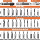 Warm Tips: Please drill a hole first when the break screw surface is smooth. Otherwise the drill bit will slip. Must be vertical and low speed when drilling, reverse use this bit, drill the first hole deeper will easier to take out. It is bettert to use electric hand drill, instead of hammer drill mode! Must be low speed during use! High Quality Hard Material - Made from hard steel, super hardness and long service life. Multiple Sizes - 33 pack damaged screw extractor set has different sizes of Drills and extractors, which provide multiple choices. Magnetic Extension Bit Holder - The upgraded magnetism bit holder can prevent tips from falling, fit all standard electric drills. Safe Storage And Portable Storage Box - ADP, bit holder, drills and extractors are have their slots. Stored neatly and orderly in a 4x5x1 inch box, wery convenient to carry. Good Helper For Most Damaged Screws - The extractor bit set is designed for troublesome stuck screws and bolts. Suitable for all bolts, machine screws, lag bolts, wood screws, hex bolts, sheet metal screws and other screws. How To Use The Bolt Extractor Set? Please note first: the size of #6 - #10 needs to be installed in the socket adapter first, and then attach it to the extension bit holder (size #1 - #5 can be attached to the extension bit holder directly). 1. Install drill (Dr) bit to drill a hole in broken screws. 2. Change the extract (Ex) bit with same size. 3. Use the drill bit backwards to get out the broken bit. Screwdriver Bits Model: Phillips screw: PH0, PH1, PH2, PH3 Slotted screw:4.0, 5.0, 6.0 Torx screw:T15, T20, T25 Package Included: 20 damaged screw extractor(Ex#1 - #10, Dr#1 - #10) 10 screwdriver Bits 1 Socket Extension Bit Holder 1 Extension Adapter 1 Adapter High Quality Material --- Screw extractor set is made of high speed steel, high hardness, durable and has a long service life. Easy to remove damaged screws. ⚠️NOTE: Install on an electric hand drill, not a hammer drill, at low speed. Easy to Use --- Stripped screw remover is can remove in one step. First choose a rotor that is smaller than the damaged screw, turn out a clean hole, then choose an extraction rotor of the same size as you are removing the damaged screw. Our Guarantee & Package Inclusion --- If you are not satisfied with the extractor set you received, please contact us within 45 days for a return. You will receive 10 drill bit set (Dr#1-#10), 10 screw extractors (Ex#1-#10), 10 screwdriver bits, complete with drill holder and adapter socket. Versatile --- Stripped screw extractor set suitable for most types of screws such as socket head cap bolts, lag head screws, wood screws, hex head screws, machine screws, sheet metal screws, lag head bolts, hex head bolts, etc. Portable & Perfect Gift --- Bolt extractor set size :3.9 x 5.07 x 1 inches, and quality carrying case make sure you don't lose one! Great birthday gift, Father's Day gift for dads, husbands, and crafters.