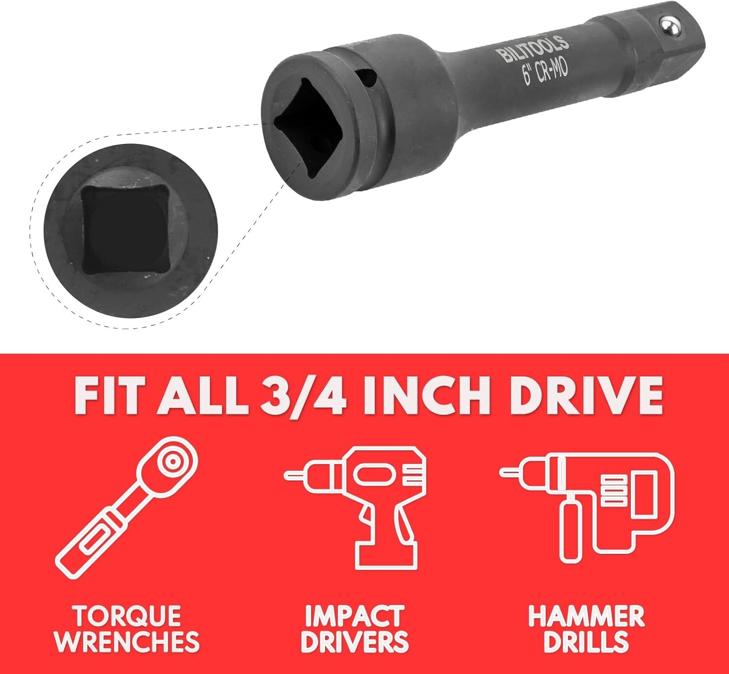 BILITOOLS 3/4" Drive Impact Extension Set 4", 6", 10" CR-MO Steel Socket Ratchet Wrench Extension Bar Set About this item Comes with 3 3/4" drive impact extension bars with length: 4", 6" and 10". 3 different extension lengths is designed to lossen or tighten fasteners in hard-to-reach areas. It can be used with air drive, electric, and pneumatic impact wrenches. Spring-loaded detent ball design keeps extensions securely latched to sockets. Drive end has through-hole to lock onto drive tang. This extension set is constructed with CR-MO steel and featured with corrosion-resistant black phosphate for durability. It has a high-visibility laser-etched size marking for easy identification. Our extension set comes with a storage case, reduce friction during transportation and handling, keep the items in good condition for a long service life. Easy carry and storage.