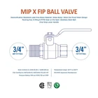Heavy-duty brass construction for enhanced durability Features a vinyl lever handle for easily shutting off the valve Creates leak-free MIP x FIP connections for reliable performanceThe Plumber's Choice Premium Brass Ball Valve is the ideal choice for water control in your piping systems. It features a stainless steel ball, FIP x MIP connections, vinyl lever handle, blow out proof stem design and PTFE seal. Manufactured with the highest quality materials and workmanship, it will serve your plumbing needs faithfully.Heavy duty DZR lead free brass construction Vinyl lever handle for easy water shut-off Secure, leak-free MIP x FIP connections Working pressure 150 psi WSP; 600 PSI WOG, working temperature -20°F - 300°F CSA and UPC approved For reliable water s... 3/4 in.FIPx3/4 in.MIP,Premium Brass Full Port Ball Valve822256MF Heavy-duty brass construction for enhanced durability Features a vinyl lever handle for easily shutting off the valve Creates leak-free MIP x FIP connections for reliable performanceThe Plumber's Choice Premium Brass Ball Valve is the ideal choice for water control in your piping systems. It features a stainless steel ball, FIP x MIP connections, vinyl lever handle, blow out proof stem design and PTFE seal. Manufactured with the highest quality materials and workmanship, it will serve your plumbing needs faithfully.Heavy duty DZR lead free brass construction Vinyl lever handle for easy water shut-off Secure, leak-free MIP x FIP connections Working pressure 150 psi WSP; 600 PSI WOG, working temperature -20°F - 300°F CSA and UPC approved For reliable water shutoff in your piping systems Item Specifics Brand Unbranded Type Ball Valves Item Length Item Width 0.75 in Item Height 0.75 in MPN 822256MF Model 822256MF Application Natural Gas,Non-Potable Water,Oil,Potable Water Compatible Pipe Material Multi-Purpose Connection FIP x MIP Features Chemical Resistant Handle Style Lever Indoor/Outdoor Indoor,Outdoor Material Brass Maximum Pressure (PSI) 600 PSI Maximum Working Temperature (F) 300 Pack Size 1 Product Weight (lb.) 0.5 lb Inlet Diameter (In.) 3/4 Outlet Diameter (In.) 3/4 Product Height (in.) 0.75 in Product Length (in.) 2.5 in Product Width (in.) 0.75 in Payment All the orders will be shipped within 1-4 working days after the payment is completed; We will choose the most suitable logistics company from USPS/UPS/FedEx/SpeedPAK based on the size of the package; Buyers usually receive package within 1-6 days, and data from the last month shows that 98.25% of buyers will receive the package within 3-4 days. If you have any questions about product quality, logistics transportation, product usage, etc., Please do noitiate a request directly, it is not the best and fastest solution. please contact us via eBay Message, We will resolve it within 8 hours. We will leave you a positive review as soon as the order is completed; If you are satisfied with the product or service and willing to give me a positive review, we would greatly appreciate it; If you have any questions about the product, please contact us and we will provide you with the best and fast solution. Temporary sold out products that need to transferred from other warehouses may take around 8-12 days to complete delivery. Please be patient. Shipping All the orders will be shipped within 1-4 working days after the payment is completed; We will choose the most suitable logistics company from USPS/UPS/FedEx/SpeedPAK based on the size of the package; Buyers usually receive package within 1-6 days, and data from the last month shows that 98.25% of buyers will receive the package within 3-4 days. Returns Contact Us If you have any questions about product quality, logistics transportation, product usage, etc., Please do noitiate a request directly, it is not the best and fastest solution. please contact us via eBay Message, We will resolve it within 8 hours. We will leave you a positive review as soon as the order is completed; If you are satisfied with the product or service and willing to give me a positive review, we would greatly appreciate it; If you have any questions about the product, please contact us and we will provide you with the best and fast solution. Temporary sold out products that need to transferred from other warehouses may take around 8-12 days to complete delivery. Please be patient. Shop Category Store Home Other Hot Item Screw Drive Garage Door Opener Genie MachForce Plus 2 HPc Added Wireless Keypad USD 394.24 24 In. X 96 In. Walnut Real Wood Veneer 10 Mil Paperback Easy Installation Brown USD 48.90 Modular Battery for Cat.60155 Hard Hat Cooling Fan USD 46.99 16 In. Roulette Set with Accessories USD 40.77 Bonaire Durango Evaporative Cooler Rigid Media Swamp Cooler Pads USD 128.70 New List Item Help & Info Payment Policy Shipping Policy Return Policy FAQ About Us 3/4 in.FIPx3/4 in.MIP,Premium Brass Full Port Ball Valve822256MF Heavy-duty brass construction for enhanced durability Features a vinyl lever handle for easily shutting off the valve Creates leak-free MIP x FIP connections for reliable performanceThe Plumber's Choice Premium Brass Ball Valve is the ideal choice for water control in your piping systems. It features a stainless steel ball, FIP x MIP connections, vinyl lever handle, blow out proof stem design and PTFE seal. Manufactured with the highest quality materials and workmanship, it will serve your plumbing needs faithfully.Heavy duty DZR lead free brass construction Vinyl lever handle for easy water shut-off Secure, leak-free MIP x FIP connections Working pressure 150 psi WSP; 600 PSI WOG, working temperature -20°F - 300°F CSA and UPC approved For reliable water shutoff in your piping systems Item Specifics Brand : Unbranded Type : Ball Valves Item Length : Item Width : 0.75 in Item Height : 0.75 in MPN : 822256MF Model : 822256MF Application : Natural Gas,Non-Potable Water,Oil,Potable Water Compatible Pipe Material : Multi-Purpose Connection : FIP x MIP Features : Chemical Resis