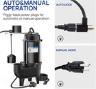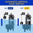 3/4HP Sewage Pump Submersible, 6400 GPH Cast Iron Sump Pump with Automatic Integrated Vertical Float Switch and Piggyback Plug, 2'' NPT Discharge Basements Pump for Wastewater, Sewer Efficient Performance: This 3/4 HP submersible sewage ejector pump features a high-efficiency, oil-filled motor for reliable performance. It can pump up to 6400 gallons of water and lift it 29 ft. Its powerful yet quiet motor excels in harsh environments like residential sewage and basement drainage Automatic and Manual Control: Equipped with an integrated vertical float switch and piggyback plug, this water pump offers both automatic and manual operation. It automatically starts when the water level rises above inches and stops when the water level falls below inches Durable and Clog-Resistant Design: Constructed from cast iron for extended life in demanding sewage applications, this sewage pump features a vortex impeller designed to minimize clogging from debris at the bottom of the pit. The 2-inch NPT discharge port can handle solids up to 2 inches in diameter Safe and Convenient: The pump features automatic thermal overload protection to prevent overheating and damage by shutting off when running dry. It includes a 10 ft UL listed power cord for safe operation. Ensure the pump is fully submerged before use and protect it from freezing. Not for septic tanks What You Get: Ideal for residential and commercial sewage and dewatering tasks, this pump is 100% manufacturer-tested and comes with a 2- support period. For any questions, our service team is available to respond within 24 hours