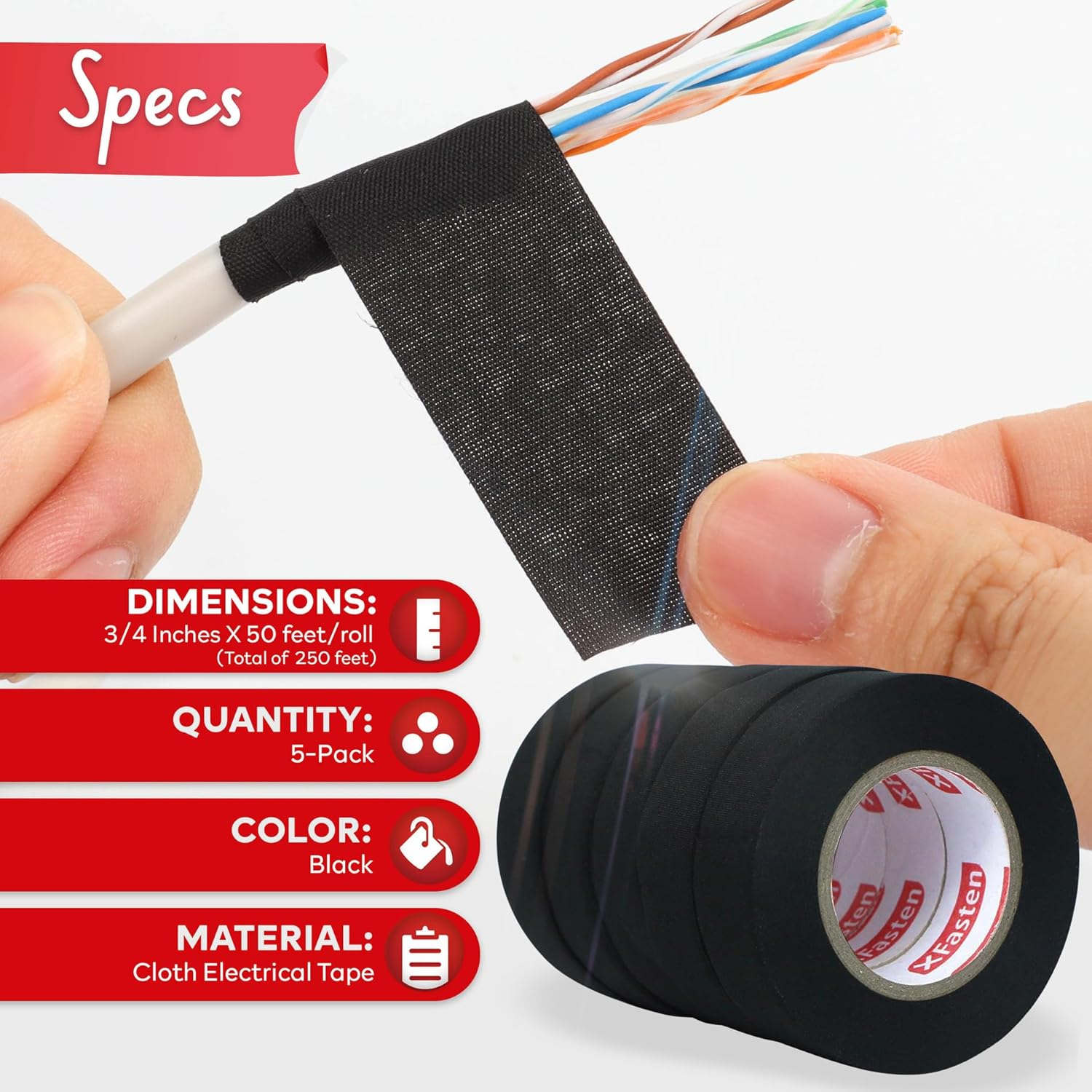 High temp Wire Harness Automotive Cloth Tape with excellent sound and rattle dampening performance. Lessens coil whining and lasts well against elevated temperatures (-40℉ - 257℉). Sports a race-spec heavy-duty bundling performance but cleanly tears with just bare hands, EMPOWERING average car owners with LITTLE TO NO EXPERIENCE in automotive maintenance to achieve PROFESSIONAL-GRADE results in function and form. This Wire Loom Tape features an extremely strong adhesive but does not turn into a messy goo. Rated to last up to 6 years and can easily get you through 150k miles of mileage. Its bi-directional weave makes it puncture-resistant and abrasion and corrosion-resistant. This automotive felt tape preserves cables in their pristine condition. This engine tape wrap is similar, if not better, in thickness, tensile strength and looks with OEM wire harness tapes. Extra-sticky adhesive enables users to bundle hard-to-reach cables quickly. Product Description About The XFasten Wire Harness Tape Key Features High Tensile Strength Precisely engineered to have a similar thickness, tensile strength, and look and feel to OEM brands. Prevents Coil Whining Prevents coil rattling - making it an essential high temp fiber electrical tape for a silent automotive wire loom. Excellent Thermals Fire-retardant and can be used as a high temp heat shield. The XFasten Wire Harness Tape can withstand temperatures up to 257℉. Reliable Lasts for years without residue-leak - thanks to it being high heat-resistant, corrosion-resistant, and puncture-resistant. 1 Step 1 2 Step 2 3 Step 3 Heavy-Duty Bundling Performance XFasten Wire Harness Tape Reliable and extremely Strong. These are the words to describe the XFasten Wire Harness Tape. Unlike other wire harness tapes that ooze out a messy goo after exposure to heat, this engine wire loom tape can last for years without residue and leaks. It's resistant to high heat, corrosion, and puncture. The XFasten Wire Harness Tape is also precisely engineered to have a similar thickness, strength, and feel to OEM brands to keep your wires and cables always in pristine condition. The video showcases the product in use. The video guides you through product setup. The video compares multiple products. The video shows the product being unpacked. video Merchant Video The XFasten Wire Harness Tape Collection Add to Cart Add to Cart Add to Cart Add to Cart Add to Cart Add to Cart Add to Cart Customer Reviews 4.7 out of 5 stars 2,131 4.7 out of 5 stars 2,131 4.7 out of 5 stars 2,852 4.7 out of 5 stars 2,131 4.7 out of 5 stars 2,131 4.7 out of 5 stars 2,131 4.7 out of 5 stars 2,131 Price $5.99 $ 5 . 99 $9.99 $ 9 . 99 $13.99 $ 13 . 99 $13.99 $ 13 . 99 $19.99 $ 19 . 99 $9.99 $ 9 . 99 $14.99 $ 14 . 99 Width 3/4" 3/4" 3/4" 3/4" 3/4" 1.3" .35", .60", .75", .99", 1.26" Length 50 Feet 50 Feet 50 Feet 90 Feet 90 Feet 50 Feet 50 Feet Quantity Single Roll 3 Rolls 5 Rolls 3 Rolls 5 Rolls Single Roll 5 Rolls Adhesive Color Black Black Black Black Black Black Black Double Sided ✘ ✘ ✘ ✘ ✘ ✘ ✘ Residue-Free ✔ ✔ ✔ ✔ ✔ ✔ ✔