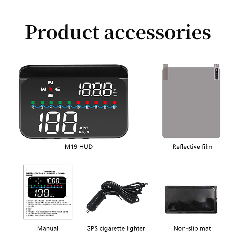 Description HUD Specifications: working voltage DC5V Working current 40mA sleeping current 15mA Speed range 0-400KM Real time precision The same as satellite Satellite positioning time Cold start: 30s, hot start: 1s HUD size 90*55*30mm 12V car charger 1000mA HUD weight 160g HUD Main Functions&Features: Available for any car, easy to install, plug and play Screen 3.5 inch HD display Multi-color design makes the screen more abundant and easier to read Nano-technology to eliminate double reflections,more clear. Rich Contents: speed,compass, speed alarm,free switch between km and miles Auto power on/off: HUD start and off with vehicle started and shutdown, effective protection of the car battery;retaining the manual switch mode,more easy to control HUD. Automatic and manual brightness adjustment mode,driving without glare. Methods of pasting the film: Spray some water on the place that the film will be pasted on,and then use a dry cloth to clean it; Take off the back side(marked 1) of reflection film,then paste it to the window glass. After you have adjusted the location, you can use a scratch board or something else flat to slick the film and squeeze the water inside out until there is no bubble or water in it. Take off the protection film (marked 2) of the reflection film. If the film cannot display the whole information, please adjust the non-slip mat to move the position. Solution for Common Problems Feature: HUD screen without any display,and no power Check the car charger cable if it is tight, pull down repeatedly inserted multiple times, check the HUD switch if it powers on. If there still no display please try another car to test and analyze whether the car cigarette lighter interface is bad, if it is a bad cigarette lighter, please try to connect the cable line to the car battery. No speed ,auto powers off after 5 minutes. The default auto powers off time is 5 minutes, if there is no speed, HUD will power off after 5 minutes,it built-in vibration switch, as long as there is a slight vibration it will powers on. Inaccurate Speed When HUD is power on,vertical press the wave button 5 seconds to enter into the menu options, here menu options shows 0,parameter shows 107,up or down the wave button to increase or decrease the value according to the difference until it shows correct one.After adjustment, vertical press in 5 seconds to save it. HUD see not clearly under the sunlight. Check whether the HUD host protective film is torn,and please stick the reflection film on the windscreen. wrong operation lead to crashes. Or inaccurate datas Do a reset setting. Package Included: 1 x HUD host 1 x charger 1 x non-slip pad 1 x reflective film 1 x manual