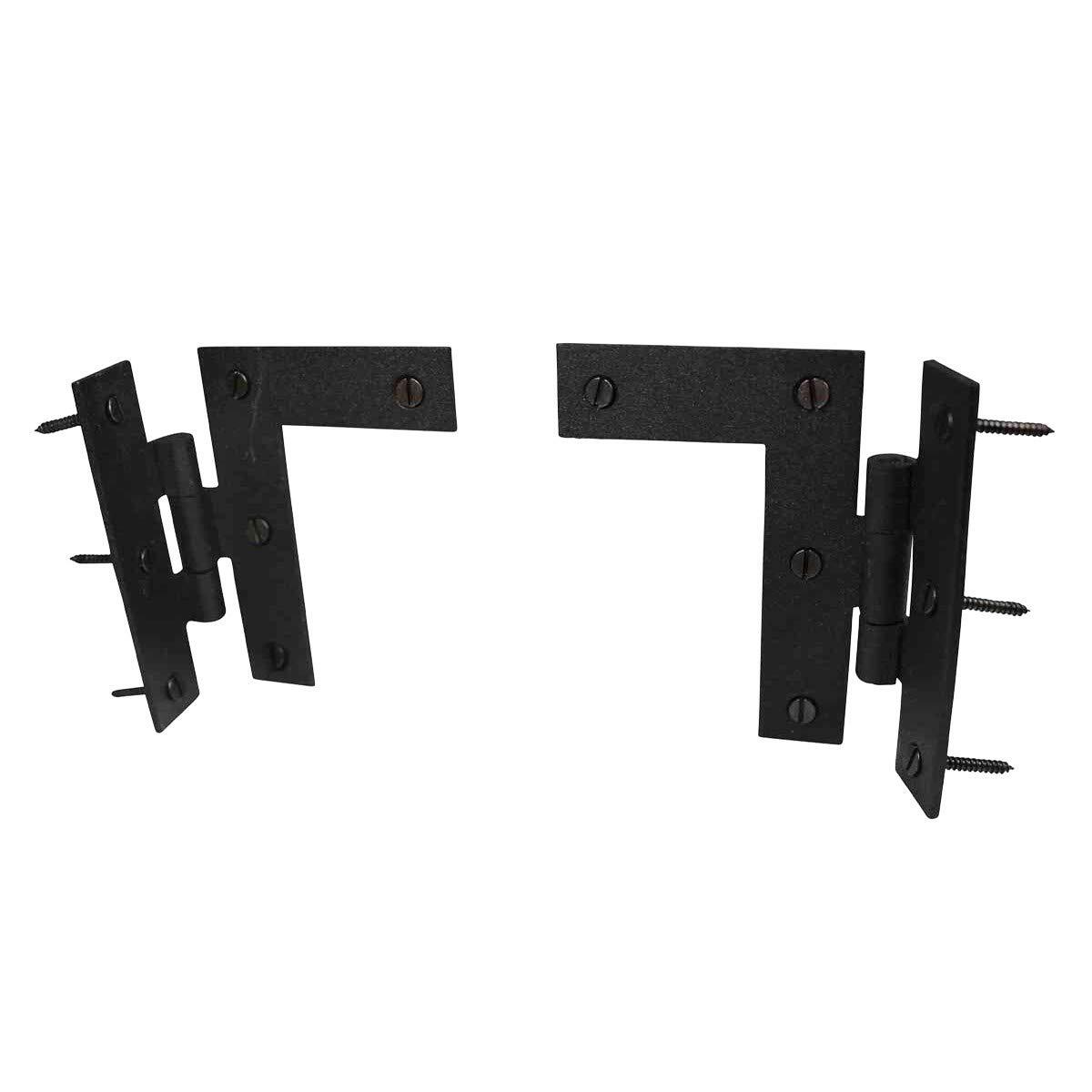 BLACK WROUGHT IRON H-L FLUSH DOOR HINGES - LEFT AND RIGHT - PAIR Affordably upgrade or reclaim your home, farmhouse or office furniture like cabinets, wardrobe, chest, Kitchen cupboards, armoires, barn doors or gates using these HL door hinges. These antique black hinges crafted of high quality wrought iron material are suitable for all your applications having a flush surface. FEATURE 2 Wrought Iron Hinges (Left and Right) Flush Mount to walls or doors Wrought iron construction lasts longer than the competition Exclusive black rust resistant powder coat finish resists rust and weather elements Included screws are intended for indoor purpose Easy installation with a smooth open mechanism Imparts a Colonial vintage charm SPECIFICATIONS Material = Wrought Iron Colour = Black Finish = Rust Resistant Powder Coat Total Hinge Length = 3-1/2" Inches Total Hinge Width = 3-7/8" Inches Barrel Length = 2" Inches Installation = Flush Mount FREE MOUNTING HARDWARE The package includes free slotted pyramid head screws, these are intended for indoor use. 100% SATISFACTION These are carefully wrapped to avoid any scratches in the transit process. offers you great value products for your money and a perfect way to spend wisely. We also provide 30 days with no fee. DURABLE MATERIAL - Our black HL flush mount door hinges are manufactured of superior wrought iron material. Our protective rust resistant black powder coating finish makes it apt for indoor and outdoor use. DIMENSIONS - Total Hinge Length -3.5 Inches, Total Hinge Width with L - 3.8 Inches, Barrel Length - 2 Inches, Mounting screws - Included, Pair - Yes, LEFT and RIGHT hinges included. COLONIAL FLUSH MOUNT HINGES -This sturdy black rustic cabinet door H and L hinges add an aesthetic timeless charm to your home. Flush Hinges are the most versatile hinges and can reclaim all furniture having a flat surface. FREE MOUNTING HARDWARE - Includes free antique style slotted pyramid head mounting screws, intended for indoor use. We recommend using different for external purposes. BUY WITH CONFIDENCE - Our exclusive black powder coat finish is designed to protect the item for many years to come. We provide 100 % satisfaction for 60 days with no fee with our Black Wrought Iron HL door Hinges.