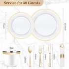 PERFECT DIMENSION - Seamlessly fitting into every occasion, this exceptional party plate set is the perfect choice. When you invest in this package, you'll receive 50 dinner plates measuring 10.25 inches, 50 salad plates at 7.5 inches, 50 sets of gold silverware with pre-rolled napkins, and 50 cups at 9 oz. DURABLE & BPA FREE - Constructed for durability and certified BPA-free, our plastic plates and silverware are manufactured from heavy-duty materials, ensuring they meet the highest food-grade standards. Feel free to utilize these gold plastic charger plates to serve hot foods such as pasta and turkey. VEERSATILE OCCASSIONS - Tailor-made for a variety of events, the elegant design and classy color scheme of these party supplies elevate any occasion. Be it weddings, anniversaries, birthdays, or bachelorette parties, the timeless gold color adds an air of sophistication. The convenience of disposable plates also means less cleanup hassle, particularly valuable for party planners looking to save time. ELEGANT DESIGN - featuring classic white plates adorned with timeless gold rims, effortlessly integrate into any event, resembling authentic ceramic plates. These disposable plates and gold silverware sets exude a classic, timeless aura, much like the cherished memories they help create for guests. CONVENIENT TO USE - No more fussing over pre-party style coordination, whether you're a planner or a host. Once the event is over, just dispose of disposable plates for a quick cleanup. Moreover, these reusable plastic plates are easy to clean and store, adding an extra layer of convenience. Make entertaining a breeze today!