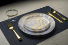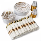 ROBUST & DURABLE- Made from heavy-duty, high-end plastic materials, this disposable dinnerware set is sturdy enough to withstand heavier foods without the risk of breaking or bending. 100% BPA FREE - Our disposable plates, cups and utensils are made from non-toxic, reusable food-grade plastic. To reuse, simply rinse with water. Note: NOT microwave or dishwasher safe. ELEGANT - Crafted with attention to detail, the golden wave design gracefully flows across the plasticware, creating an elegant and eye-catching visual appeal. The modern and sophisticated pattern adds a touch of glamor to any occasion. VERSATILE FOR ANY EVENT - Perfect for any event like weddings, holidays, baby showers, and business parties, Our dinnerware set offers convenience for diverse celebrations. WHAT’S INCLUDED: 350 Piece Plastic Silverware Set for 50 guests. 50 Dinner Plates (10.25”), 50 Dessert Plates (7.5”), 50 Cups (9oz), 50 Pre-rolled Napkins with 50 knives, 50 Forks and 50 Spoons.