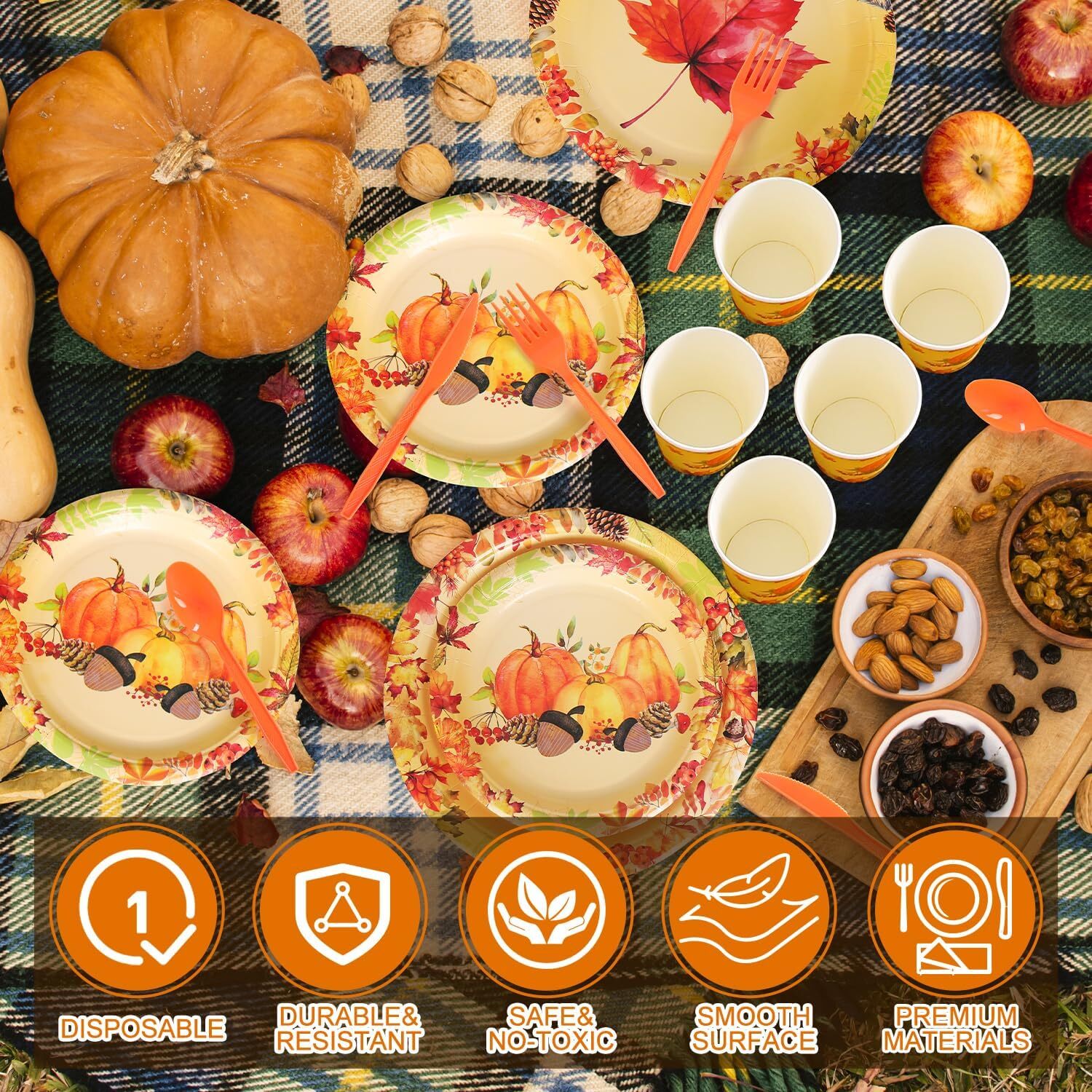 Features: This set provides an ample quantity of party essentials, designed to be waterproof, lightweight, and easy to carry and store. Please confirm the size before purchasing. Specifications: Material: Paper Color: Orange Size: 7-inch and 9-inch paper plates Package Includes: 50 x Pumpkin 7-inch paper plates 50 x Maple Leaf 9-inch paper plates 50 x Napkins 50 x 9oz Paper cups 50 x Plastic knives 50 x Plastic forks 50 x Plastic spoons TIPS: Manual measurements may cause slight size discrepancies. Color differences may exist due to different displays. Complete Autumn Dinnerware Set: Our autumn pumpkin dinnerware set includes 50 large 9-inch plates and 50 small 7-inch plates, 50 napkins, 50 9-ounce paper cups, and 50 knives, forks, and spoons, each measuring 16 cm in length. These sizes are perfect for serving various types of dishes, such as cakes, drinks, and snacks, helping to avoid confusion and adding an elegant touch to your table setting, whether you’re hosting a formal Thanksgiving dinner or a casual fall picnic. Thanksgiving Autumn Plates: Each plate in this autumn set is surrounded by a ring of maple leaves, with two different designs featuring either maple leaves or pumpkins. The blank center complements the background’s warm tones, reflecting the golden hues and vintage charm of the season. These vibrant, beautiful plates are ideal for autumn gatherings, such as Thanksgiving dinners, fall festivals, or even everyday meals, offering a lovely complement to your table decor. Save Time and Reduce Cleanup: The autumn-themed paper plates and cutlery in this set are designed for single use, helping you avoid the hassle of washing dishes. Maximize your time with loved ones and minimize the cleaning burden, allowing you to fully enjoy the festive autumn atmosphere. These plates are also less prone to breakage than traditional ceramic or glass dishes, making them the best choice for entertaining guests during Thanksgiving or other fall-themed events. Perfect Sizes for All Your Dishes: The 7-inch plates are perfect for appetizers and desserts, while the 9-inch plates are suited for main courses. The included napkins and cups are the right size for your guests to enjoy beverages and keep things tidy. This dinnerware set ensures you have the ideal plate for every dish, enhancing the overall dining experience at any fall gathering, be it a harvest festival or a cozy family dinner. Versatile and Festive: Perfect for Thanksgiving, fall-themed birthday parties, autumn picnics, or even everyday dining, this dinnerware set adds a festive touch to your gatherings. The autumnal designs are sure to impress your guests and create a memorable dining experience. Ideal for both casual and formal occasions, this set helps you celebrate the season in style, whether indoors or outdoors.