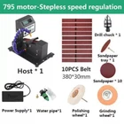 Features: -Water mill function. No knife burning, no heat -Universal hose design, no need to soak, more safe and reliable. -Polish the wood without flying dust -Wood/stone/plastic/acrylic can be easily polished without dust, which is efficient, time-saving and labor-saving -Multifunctional, suitable for polishing of various materials -Easy polishing of metal/wood/stone/plastic, efficient and time-saving -Wide range of applications, can be matched with a variety of accessories -It can install drill chuck, grinding wheel, cloth wheel, flexible shaft, etc! -One machine can be used for multiple purposes and has the function of bench grinding ·-Precision drill chuck, clamping range 0.6-6mm ·-Grinding wheel function ·-Small objects made of hard materials such as metal can be polished ·-Common sense on the use of grinding wheel: when the grinding wheel is installed on any equipment, the round surface of the grinding wheel should be trimmed for the first time of use, otherwise there will be slight vibration. Just use it more times. Flexible shaft design, easy carving. ·-It can install drill chuck, grinding wheel, cloth wheel, flexible shaft, etc! ·-Digital display design, precise speed regulation ·-Intelligent digital display screen, accurate display, real-time voltage, speed control ·-Stepless speed regulation, follow your heart ·-The speed is within the control, and the work is more rhythmic ·-Positive and negative rotation, one key adjustment ·-Make work diversified Parameters: Product size: 250mm * 150mm * 200mm Motor power: 350W Speed regulation mode: stepless speed regulation Intelligent digital display: Yes Power supply voltage: 12-24V Positive and reverse: Yes Packing list: 1x belt sander 1x power supply 1x water connection pipe 1x polishing wheel 1x grinding wheel 1x polishing wax 1x sandpaper tray 1x drill chuck 10x 30 sand belts