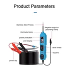 Features: Multi-features: Component Flexibility. Voltage Detection. Diode Detection. Continuity Testing. Ground Detection. Tracking to locate short circuits. Positive and negative detection. Overload Protection. Lighting. Sound Alert. LCD High Definition Display: When the probe detects a positive pole or performs a positive activation, the front red LED lights up with a blue LCD voltage display. When the probe detects a negative terminal or performs a reverse activation, the front green LED lights up with a blue LCD voltage display. Lighting Design: Unique design for easy maintenance lighting at night. Easy to use at night. Wide Range of Products: Support all 3.5-36V electrical system testing, including cars, pickup trucks, off-road vehicles, motorcycles, construction vehicles, boats, etc. Specifications: Item name: Automotive Circuit Tester Model: CNBJ-823 Item color: Blue DC voltage range: 3.5-36V Over-current protection current: 8A Rated current: 1-8Amp Accuracy: ±2% Line length: 4.5 meters Operational temperature: -10 to 60℃/-4 to 158℉ Relative humidity: < 80% Item size: Approx.26*4*2.8cm/10.23*1.57*1.10in Total weight: 390g/13.75oz The package: 1 * Automotive Circuit Tester
