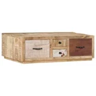 This coffee table exudes an attractive charm. It will truly be a centerpiece of your interior. The couch table is made of solid mango wood, a hardwood with dense grains. Rough mango wood not only has the strength to bear the weight, but also stands the wear and tear of time. Therefore this beautifully-designed wooden coffee table is exceedingly stable, durable and captivating. Additionally, this side table is fully handmade and the refined wood grains make every piece of furniture distinctive and slightly different from each other. This living room table features 4 drawers, providing commodious space for storing your coffee cups, books, as well as various other items. Important note: The wood grains vary from piece to piece, making each piece unique; the delivery is random. Material: Solid mango wood, goat leather, engineered wood Dimensions: 35.4" x 23.6" x 11.8" (L x W x H) Finish: Polished, painted and lacquered With 4 drawers California Proposition 65 Warning: This product can expose you to chemicals including wood dust, which is known to the State of California to cause cancer. For more information go to . Shipping Restrictions Due to the limited access of our couriers, this item cannot be delivered to the following locations: Alaska Federated States of Micronesia Guam Hawaii Marshall Islands Military Posts (APO / FPO) Palau Puerto Rico US PO BOX Virgin Islands Our customer support will contact buyers for orders with no shipment service, and these orders will be cancelled and fully refunded afterwards.
