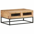 Introduce an air of industrial charm into your home decor with this stylish wooden coffee table! This couch table is made of solid acacia wood, making it sturdy and stable. The craftsmanship and the beautiful wood grains make every piece of furniture unique and slightly different from the next. The center table is equipped with 2 drawers, so you can display or keep any items you'd like well organized. What's more, the steel base adds to its sturdiness. Important note: The wood grains and colors vary from piece to piece, making each vitrine cabinet unique. Material: Solid acacia wood with a natural finish, glass, powder-coated steel Dimensions: 35.4" x 23.6" x 15.7" (W x D x H) Assembly required: Yes California Proposition 65 Warning: Cancer and Reproductive Harm – . Shipping Restrictions Due to the limited access of our couriers, this item cannot be delivered to the following locations: Alaska Federated States of Micronesia Guam Hawaii Marshall Islands Military Posts (APO / FPO) Palau Puerto Rico US PO BOX Virgin Islands Our customer support will contact buyers for orders with no shipment service, and these orders will be cancelled and fully refunded afterwards.
