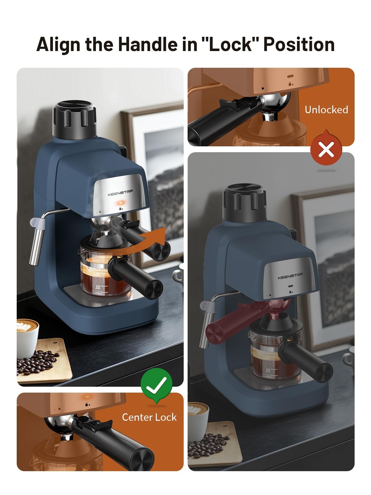Easy to Make Hot and Iced Coffee: Single switch knob with indicator light for simple operation.Turn the control knob to the "OFF" position to relieve pressure before opening the water tank cap or removing the portafilter. Innovative pause function allows you to deal with unexpected event. More suitable for beginners. Fast Brewing Technology: Advanced heating technology makes water quickly heat to the right temperature. 3.5 bar pressure coffee maker can make 1-4 cups (240ml) of coffee within 2 minutes. Easy-pour glass cup is clearly marked to serve the perfect amount every time and delivers a truly rich espresso in seconds. Warm Tips:Add Max 240ml water, otherwise the nozzle will leak. Powerful Steam Wand: High power 800W element for high pressure steam and faster heat up to create the micro-foam in 40 seconds, ready to make creamy cappuccino and latte art without wait. Accurate temperature control can ensure the best taste. We advise you clean the steam wand after every use, otherwise the steam wand may be blocked by milk scale and water scale. Warm Tips: Don't add water asap after making coffee to prevent burns. Space Saving and User Friendly: This compact coffee maker is smaller than most. Dimensions are 13.1" high x 7.7" wide x 10" deep, weight only 4.7 pounds. Fits in any kitchen while maintaining key features like heat control, bar pressure, and milk frothing. BPA Free. Robust and low noise, suitable for all families. (Don't put accessories in dishwasher) NOTICE: 1. FILTER MUST BE FULLY LOCKED! Pls always turn the handle to the lock symbol on the head of machine. 2. Don’t use too fine coffee ground, only medium ground is suggested. 3. Please clean the coffee ground on the edge of the filter.