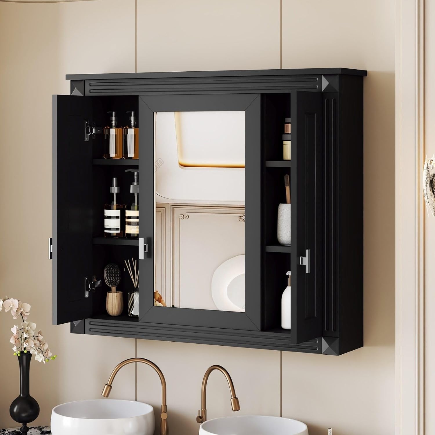 Product Description About this item AMPLE STORAGE SOLUTION - This 35" x 7.13" x 28.74" wall-mounted bathroom mirror cabinet provides generous storage space with 3 doors (1 mirrored) and 5+ shelves, perfect for organizing toiletries, medicines, and bathroom essentials without taking up floor space VERSATILE 2-IN-1 DESIGN - Features a high-definition mirror for daily grooming plus hidden storage compartments, allowing you to store personal items while maintaining a clean, organized bathroom appearance. Mount above toilet or sink for maximum functionality CUSTOMIZABLE ORGANIZATION - Interior shelves adjust up to 3 inches in height to accommodate items of various sizes, from tall bottles to small toiletries. The storage design helps optimize your bathroom space efficiently PREMIUM CONSTRUCTION - Made from high-quality MDF with a waterproof painted finish that resists bathroom humidity. Silent buffer hinges ensure smooth, quiet door operation with a weight capacity of up to 300 lbs overall MODERN MINIMALIST AESTHETIC - Sleek black finish and clean lines complement any bathroom decor from contemporary to transitional styles. Easy installation with all necessary hardware included and clear illustrated instructions Specifications: -Main Color: Black -Main Material: MDF -Mount Type: Wall Mounted -Cabinet Finish Type: Painted -Cabinet Features: Adjustable Shelves -Use Case: Bathroom -Product Dimensions: Assembled Length (in.):35 Assembled Width (in.):7.13 Assembled Height (in.):28.74 -Product Weight (lbs.):41.89 -Material:Cabinet: MDF+Solid Wood(Pine)/ Handle (iron) -Capacity: Overall: 300lbs/ Panel:50lbs -Assembly Required: Yes 1. The color of the actual product may differ from the image due to the lighting or the monitor’s display. 2. Manual measurement has been used; there may be some reasonable error. Package includes: 1 x Medicine Cabinet