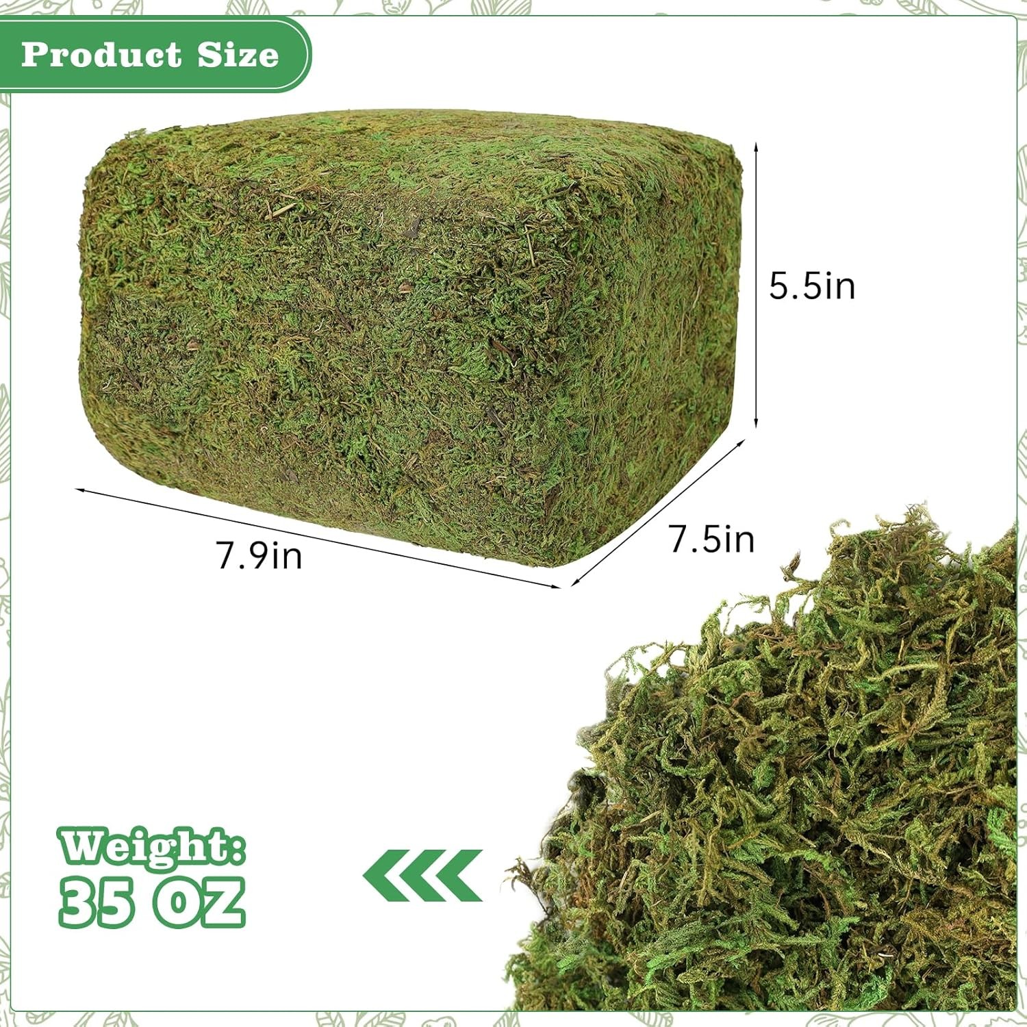 35 OZ Large Capacity Artificial Moss for Potted Plants,Natural Fresh Green Product Details Plant or Animal Product Type: Moss Indoor/Outdoor Usage: Indoor Brand: YUNVI Material Feature: Natural Color: Fresh Green Special Feature: Low Maintenance Expected Blooming Period: Spring Unit Count: 35.0 Ounce Expected Planting Period: Spring Soil Type: Sandy Soil Moisture Needs: Moderate Watering Number of Pieces: 1 Package Dimensions: 8.74 x 6.81 x 6.1 inches Item Weight: 2.14 pounds Manufacturer: YUNVI Country of Origin: China Item model number: HZ-Artificial Moss-1kg Real moss: Our artificial moss is made of premium natural moss through a series of processes such as selecting, drying and dyeing. Which is non-toxic, eco-friendly and can keep green for a long time without watering and fertilizing. Widely applications: Natural artificial moss can be used not only as plant nourishment or a substrate for reptiles or amphibians, but also as decorations - decorating table tops, etc., or you can DIY some micro-landscapes by hand so that you can use your imagination and creativity. Package includes: You will receive 35 oz(1000g) natural fake moss, enough for your daily use and replacement. Non-perishable and can be used for a long time. Green moss: The fake moss is dyed for a long lasting green color, the natural and vivid look allows you to create more beautiful spaces with the green moss and enjoy it for many years. Make your handicrafts or home decorations look more natural. Notice: The "fake grass" made from natural green moss after being dried and dyed into spring green. They are not live and will not grow! It may have a slight odor, please open it and leave it for a few days before use. Features: It can be as layering decoration for succulents. It can be used as plant nutrient soil. It can be used to decorate a moss miniature landscaper. It can be used as a decoration for weddings and other occasions. Specifications: Material: Real moss Color: Green (It will fade for a long time) Wight: 35 oz(1000g) Warm tips: Please keep this bag away from children to avoid accidental ingestion. It may have a slight odor, please open it and leave it for a few days before use.