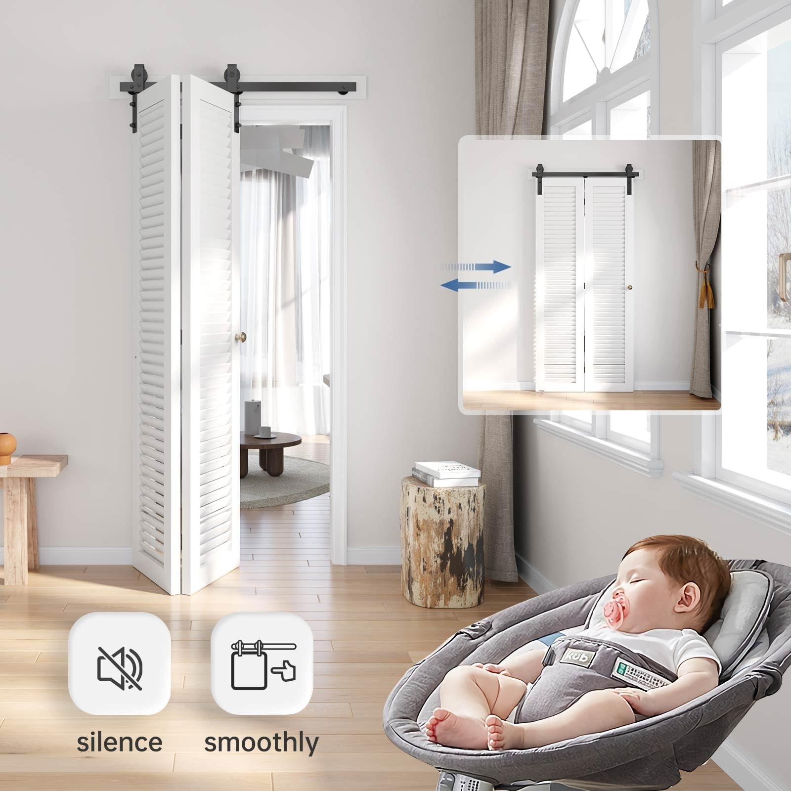 heavy-duty bifold door hardware system revolutionizes space efficiency with its innovative folding mechanism. Crafted from industrial-grade solid steel with a corrosion-resistant black powder coating, this hardware withstands daily use while maintaining its sleek appearance for years. The precision ball bearing rollers have been rigorously tested over 100,000 cycles, ensuring buttery-smooth, whisper-quiet operation that outperforms standard sliding door systems. Space-Saving: The door panel folding design takes up minimal space when opened,making it ideal for small homes,narrow hallways,or compact areas to maximize room efficiency.Can be partially or fully opened,allowing customizable ventilation and natural light control.More flexible than traditional sliding or swing doors,perfect for balconies,wardrobes,kitchen partitions,and more Smooth Gliding Like Butter: Crafted from steel with a fine black powder-coated finish,our bifold barn door hardware resists corrosion for lasting durability.Features high-precision bearing rollers tested over 100,000 cycles for buttery-smooth,silent operation-rigorously inspected for reliability Reminds: Fits up to double 16" wide bifold doors (1-3/8"~1-3/4" thickness; 180lb weight capacity). Track length = door opening + 4" (100mm). Requires 5-3/8" ceiling clearance Complete Hardware Kit: Includes 1x36" Rail,2x Rollers,2x Roller Rotating Base,1x Roller Fixator,3x Rail Support,3x Hinge,1x Floor Guide,1x Sealing Strip. DOOR NOT INCLUDED! Backed by 's 24/7 assistance,let us know for missing/defective parts,we will prompt solutions Hassle-Free Installation: Includes a step-by-step installation manual with detailed diagrams and text instructions.Get soft copy and professional installation guide from our online service