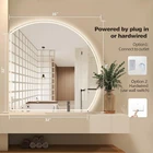 About this item 【Exquisite LED Vanity mirror】 Our backlit mirror adopting geometric border design, combining artistic sense with lighting function, built-in high-quality LED light strip, light evenly diffused through soft light layer, simulating natural light effect, not only meeting lighting needs, but also creating a warm, modern or luxurious spatial atmosphere. 【Dimmable & 3 Color Temperature】We offer three color temperature modes: warm light (3000K), natural light (4500K), and cool white light (6000K) to meet your lighting needs at different times and emotions. Long press has a brightness adjustment function of 10% to 100%, allowing you to customize the perfect light intensity that is most suitable for the current scene. 【Memory Function & Defog Feature】Automatically restore to your preferred brightness and color temperature combination every time it is turned on, without the need for repeated adjustments. Built in intelligent defogging, touch the switch after bathing to quickly disperse moisture. Say goodbye to waiting and wiping, allowing you to maintain a clear view while washing, applying makeup, or shaving, and experience a calm and leisurely daily rhythm. 【Easy to Install, Plug-in/Hardwired】Provide two installation methods: "Plugin" and "Hardwired". You can freely choose according to the wiring conditions at home: simply connect a standard socket to light up, or have a professional electrician connect the reserved line to achieve hidden wiring. Whether decorating a new house or renovating an old one, it can be easily matched. 【100% Satisfaction】 Due to the LED mirrors are fragile items and difficult to control during shipping. Contact us for lighted bathroom mirror damaged on arrival, no return needed, what you need to do is sending us some pictures via Amazon. If you are not satisfied with other details or functions, you can also contact us. The 36" Half Moon LED Bathroom Mirror is a stylish and functional addition to any bathroom, featuring a frameless design and anti-fog technology for a clear view. With a polished silver frame and LED lighting, this mirror offers a modern and elegant look. It is designed for use in various room types including the bathroom, bedroom, dressing room, hallway, or living room. The mirror's vertical and horizontal orientation, along with its large size of 36" x 36", make it ideal for applying makeup, getting ready in the morning, or simply admiring your reflection. Made in the United States, this mirror is built to last and withstand various conditions.