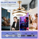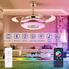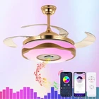 36“ Invisible Ceiling Fan 7-Color Dimmable LED Chandelier Bluetooth Music Player Singing Ceiling's Fan Lights: New Design Multi-Functional Ceiling Fan Lights, With Bluetooth audio function, Mobile Smart Remote Control (Need to Download Smart APP). Function: Bluetooth: Connect Bluetooth to play any music you want. Smart App : Download Smart APP, the you could use the mobile device to change the atmosphere light color.(7-colors change) Remote control: To control normal light color(White light,neutral light and warm white light).Change fan speed(L-M-H) Size: 91cm/36inch Material: Hardware / Acrylic / Blade ABS Superior features: no radiation, no flicker, no glare, no dark areas, green, low emissions, 50000h life, low power consumption. Control Mode: Wall Control / Remote Control / Wireless Bluetooth(Don't come with wall control) Applicable: living room, bedroom, restaurant, etc. Suggest: Ceiling weighing ≥50KG Floor height ≥3m Packaging details 1 * Multifunctional color fan light Introduction: High-Transmittance Acrylic Lampshade: The Lampshade Adopts High-Quality Acrylic, Uniform Thickness, Strong Light Transmission, No Glare Transmission Rate of more than 92% Bluetooth Stereo: Built-in Bluetooth stereo, mobile phone just need to download APP to control music, atmosphere, lanterns, etc., subtle exchange of music. Plating Hardware Suckers / Suspensions: Thick metal materials, Bright Color, Strong, Durable, Good Bearing Capacity, Anti - Corrosion Rust, Durable. Inverted mute silicon Steel motor, Fast heat dissipation, long life. High - Quality ABS Blades: The blades are made of high-quality ABS Material, which has good toughness, Light Weight, Greater Wind power and Beautiful Lines. High-Quality Metal Shell, Frequency Conversion Mute Steel Sheet Copper Motor, Fast Heat Dissipation, Long Life. Built-In Bluetooth Audio, Mobile Phone Just Need to Download The APP to Control the Music, Atmosphere, Lanterns, and so on.