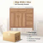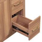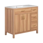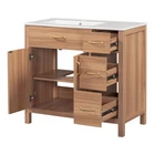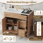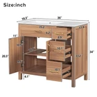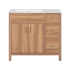 36" Wood Bathroom Vanity Modern Storage Cabine with 3 Drawers & Adjustable Shelf Features Perfect Size for Small Bathrooms:This 36"*18.3"*34" vanity is perfectly designed for small bathrooms, offering ample storage without taking up too much space. Ceramic Sink for Easy Cleaning:The high-quality ceramic sink features a smooth surface, making it easy to clean and maintain a fresh, tidy look. Overflow Hole Design for Dry Comfort:Equipped with an overflow hole, this design prevents water overflow and helps maintain a dry, comfortable bathroom. Durable Solid Wood Frame & MDF:The solid wood frame and MDF construction offer both aesthetic appeal and durability for long-lasting use. Ample Storage with Adjustable Shelf & Drawers:With three drawers and an adjustable shelf, this vanity provides flexible and spacious storage for all your bathroom essentials. Modern & Elegant Wood Finish Design:The wood finish adds a touch of natural elegance to your bathroom while blending seamlessly with modern decor. Soft Close Doors for Silent Operation:Soft close doors ensure a quiet, smooth operation every time, enhancing your bathroom's tranquility. Soft Close Drawers for Comfortable Use:The soft-close drawers prevent loud noises from abrupt closures, ensuring a quiet and comfortable usage experience. Elegant Gold Handles for a Touch of Luxury:The elegant gold handles add a touch of luxury and style to your bathroom, elevating the overall design. Easy Assembly with Clear Instructions:Comes with clear instructions for easy assembly, designed for two people to put together quickly and efficiently. Description 36" Wood Bathroom Vanity Cabinet with Versatile Storage Upgrade Your Bathroom with Timeless Elegance This 36" wood vanity in a serene natural wood finish brings timeless beauty to your bathroom. Soft close doors and drawers glide smoothly, creating a quiet sanctuary. The spacious countertop offers plenty of room for essentials, while the three drawers and two cabinets provide ample storage to keep your bathroom organized and clutter-free. Gold handles add a touch of luxury, seamlessly blending modern charm with classic design. Whether you're refreshing your space or designing a new one, this vanity brings a sophisticated, calming ambiance, turning your bathroom into a tranquil retreat for everyday indulgence. Simplicity Meets Elegance This vanity features a warm, natural wood finish, with exquisite gold handles that beautifully complement the wood grain, creating a natural and elegant atmosphere in your bathroom. It seamlessly blends with modern home decor. Ample Storage, Perfectly Organized Three soft-close drawers and two soft-close doors with an adjustable shelf provide generous storage for towels, shampoos, and other bathroom essentials, keeping your space neat and organized at all times. Built to Last with Solid Wood Frame Crafted with a solid wood frame and MDF material, this vanity is sturdy and durable, capable of withstanding daily use. It ensures stability and long-lasting quality, adding a sense of permanence to your bathroom. Spacious Countertop for Everyday Convenience The spacious countertop offers ample room for your daily essentials, while the extra space on the right side of the sink is perfect for placing dishes, cups, and other items, enhancing your everyday experience. Weights&Dimensions Product Size: 36"W*18.3"D*34"H, 113.85 lbs Sink: 36"W*18.3"D*6.3"H,37.4 lbs Vanity: 35.2"W*17.8"D*33.2"H,76.45 lbs Weight Capacity: Shelf: 20 LBS, Drawer: 50 LBS, Overall: 150 LBS Specifications Product Name: Bathroom Vanity Origin: Vietnam Style: Transitional Mounting Type: Free-standing Cabinet Color: Wood Sink Material: Ceramic Cabinet Material: Solid wood+MDF Handle Material: Zinc alloy Finish Type: Wood Veneer Finish Sink Type: Undermount/Drop in Sink Shape: Rectangular Faucet Mount: 8" widesperad (not included) Overflow Hole included: Yes Vanity Top Edge Type: Flat Edge Thickness: 0.7" Number of Doors: 2 Number of Drawers: 3 Soft Close Door Hinges: Yes Soft Close Drawer Slides Yes Assembly: Assembly Required